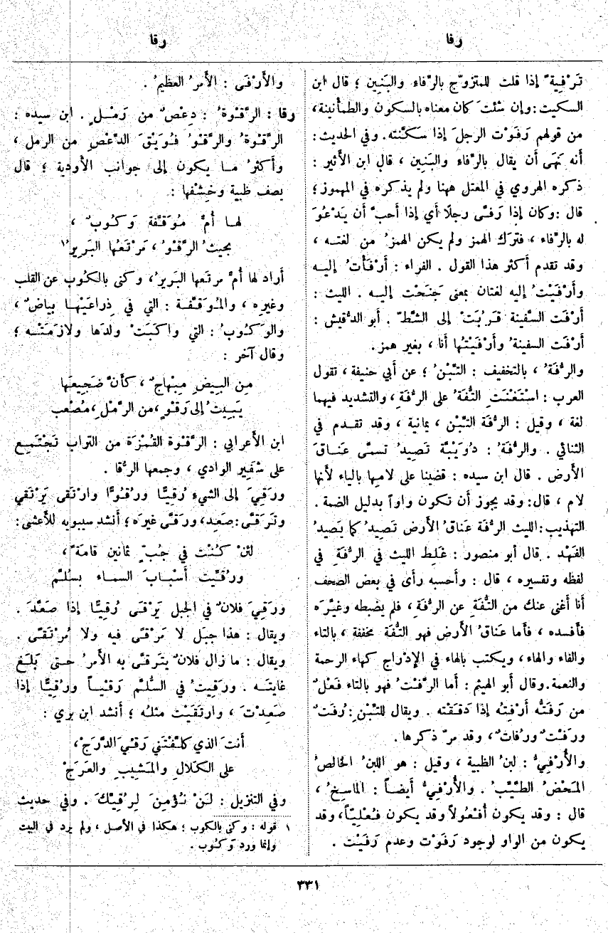 ، قَالَ ابْنُ الأَثير: ذَكَرَهُ الْهَرَوِيُّ فِي الْمُعْتَلِّ هَاهُنَا وَلَمْ يَذْكُرْهُ فِي الْمَهْمُوزِ؛ قَالَ: وَكَانَ إِذَا رَفَّى رَجُلًا أَي إِذَا أَحبَّ أَن يَدْعُوَ لَهُ بالرِّفاء، فترَك الْهَمْزَ وَلَمْ يَكُنِ الهمزُ مِنْ لُغَتِهِ، وَقَدْ تَقَدَّمَ أَكثر هَذَا الْقَوْلِ. الْفَرَّاءُ: أَرْفَأْتُ إِلَيْهِ وأَرْفَيْتُ إِلَيْهِ لُغَتَانِ بِمَعْنَى جَنَحْت إِلَيْهِ. اللَّيْثُ: أَرْفَت السَّفينة قَرُبَتْ إِلَى الشَّطّ. أَبو الدُّقيش: أَرْفَت السفينةُ وأَرْفَيْتُها أَنا، بِغَيْرِ هَمْزٍ. والرُّفَةُ، بِالتَّخْفِيفِ: التِّبْنُ؛ عَنْ أَبي حَنِيفَةَ، تَقُولُ الْعَرَبُ: اسْتَغْنَتِ التُّفَةُ عَلَى الرُّفَةِ، وَالتَّشْدِيدُ فِيهِمَا لُغَةٌ، وَقِيلَ: الرُّفَة التِّبْن، يَمَانِيَّةٌ، وَقَدْ تَقَدَّمَ فِي الثُّنَائِي. والرُّفَةُ: دُوَيْبَّة تَصِيدُ تسمَّى عَناقَ الأَرض. قَالَ ابْنُ سِيدَهْ: قَضَيْنَا عَلَى لامِها بِالْيَاءِ لأَنها لَامٌ، قَالَ: وَقَدْ يَجُوزُ أَن تَكُونَ وَاوًا بِدَلِيلِ الضَّمَّةِ. التَّهْذِيبُ: اللَّيْثُ الرُّفَة عَناقُ الأَرض تَصِيدُ كَمَا يَصيدُ الفَهْد. قَالَ أَبو مَنْصُورٍ: غَلِط اللَّيْثُ فِي الرُّفَةِ فِي لَفْظِهِ وَتَفْسِيرِهِ، قَالَ: وأَحسبه رأَى فِي بَعْضِ الصُّحُفِ أَنا أَغنى عنك من التُّفَةِ عَنِ الرُّفَةِ، فَلَمْ يَضْبُطْهُ وغيَّرَه فأَفسده، فأَما عَناقُ الأَرض فَهُوَ التُّفَة مُخَفَّفَةً، بِالتَّاءِ وَالْفَاءِ وَالْهَاءِ، وَيُكْتَبُ بِالْهَاءِ فِي الإِدْراج كَهَاءِ الرَّحْمَةِ وَالنِّعْمَةِ. وَقَالَ أَبو الْهَيْثَمِ: أَمَّا الرَّفْتُ فَهُوَ بِالتَّاءِ فَعْلٌ مِنْ رَفَتُّه أَرْفِتُه إِذَا دَقَقْته. وَيُقَالُ للتِّبْنِ: رُفَتٌ ورَفْتٌ ورُفاتٌ، وَقَدْ مَرَّ ذِكْرُهَا. والأُرْفِيُّ: لبنُ الظَّبْيَةِ، وَقِيلَ: هُوَ اللبنُ الخالصُ المَحْضُ الطَّيِّبُ. والأُرْفِيُّ أَيضاً: الماسِخُ، قَالَ: وَقَدْ يَكُونُ أُفْعُولًا وَقَدْ يَكُونُ فُعْلِيّاً، وَقَدْ يَكُونُ مِنَ الْوَاوِ لِوُجُودِ رَفَوْت وَعَدَمِ رَفَيْت. والأَرْفَى: الأَمرُ العظيمُ.