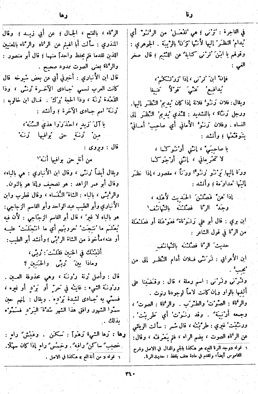 ورَنا إِلَيْهَا يَرْنُو رُنُوّاً ورَناً، مَقْصُورٌ، إِذَا نظرَ إليْها مُداوَمة؛ وأَنشد: