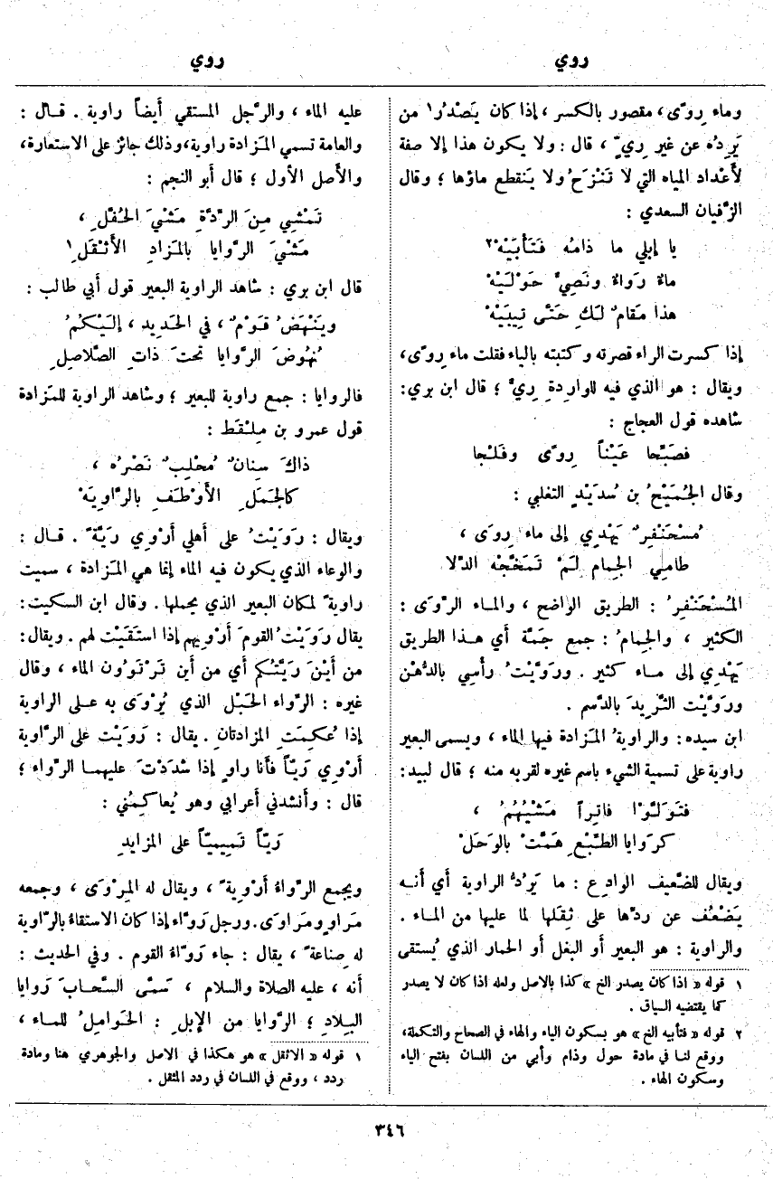 ف الرَّوَايا: جَمْعُ رَاوِيَة لِلْبَعِيرِ: وَشَاهِدُ الرَّاوِيَة للمَزادة قَوْلُ عَمْرِو بْنِ مِلْقَط: