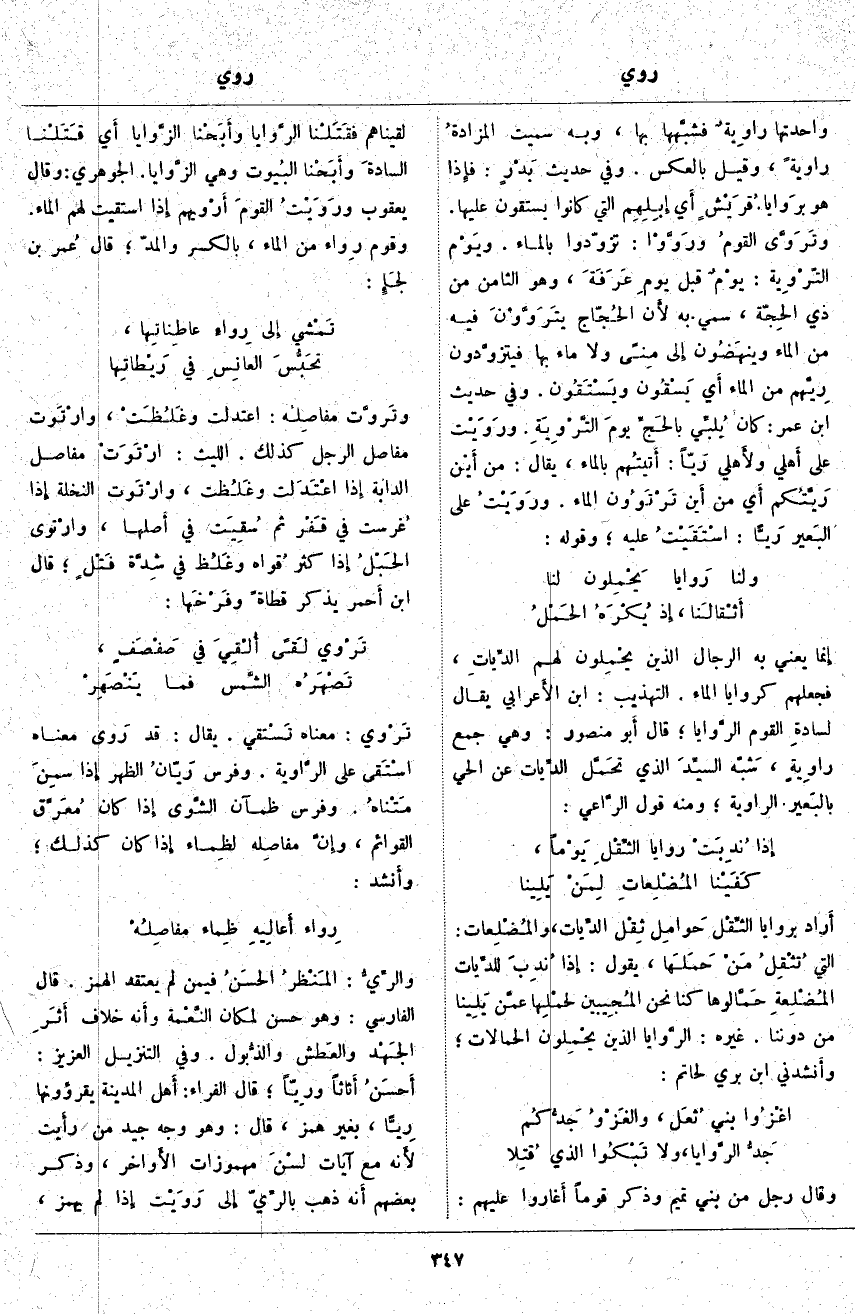 وَقَالَ رَجُلٍ مِنْ بَنِي تَمِيمٍ وَذَكَرَ قَوْمًا أَغاروا عَلَيْهِمْ: لَقِينَاهُمْ فقَتَلْنا الرَّوَايَا وأَبَحْنا الزَّوايا أَي قَتَلْنا السادةَ وأَبَحْنا البُيوت وَهِيَ الزَّوايا. الْجَوْهَرِيُّ: وَقَالَ يَعْقُوبُ ورَوَيْتُ القومَ أَرْويهم إِذا اسْتَقَيْتُ لَهُمُ الْمَاءَ. وَقَوْمٌ رِوَاء مِنَ الْمَاءِ، بِالْكَسْرِ وَالْمَدِّ؛ قَالَ عُمر بْنُ لجَإٍ: