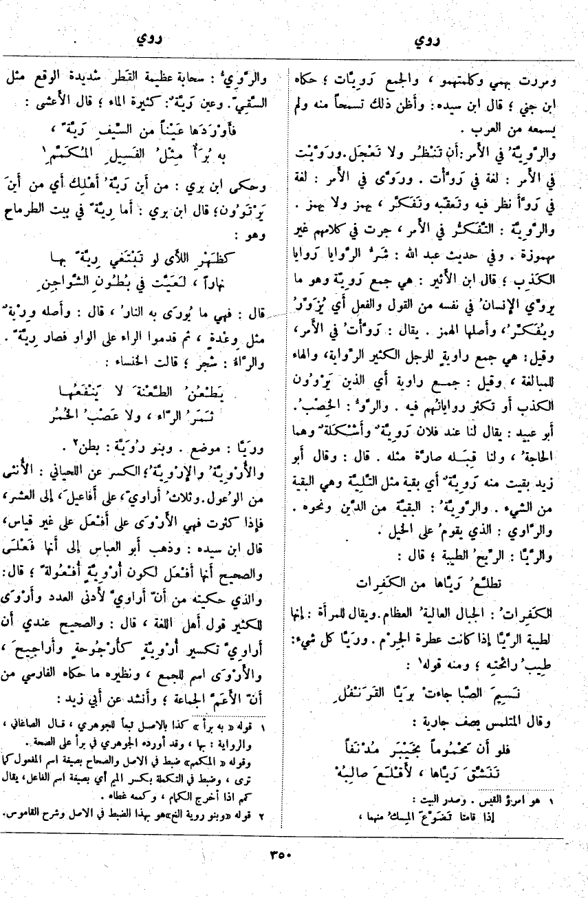 وَمَرَرْتُ بِهِمِي وَكَلَّمْتُهُمُو، وَالْجَمْعُ رَوِيَّات؛ حَكَاهُ ابْنُ جِنِّي؛ قَالَ ابْنُ سِيدَهْ: وأَظن ذَلِكَ تَسَمُّحًا مِنْهُ وَلَمْ يَسْمَعْهُ مِنَ الْعَرَبِ. والرَّوِيَّةُ فِي الأَمر: أَن تَنْظُر وَلَا تَعْجَل. ورَوَّيْت فِي الأَمر: لُغَةٌ فِي رَوَّأْت. ورَوَّى فِي الأَمر: لُغَةٌ فِي رَوَّأَ نَظَرَ فِيهِ وتَعقّبه وتَفَكَّر، يُهْمَزُ وَلَا يُهْمَزُ. والرَّوِيَّة. التَّفَكُّر فِي الأَمر، جَرَتْ فِي كَلَامِهِمْ غَيْرَ مَهْمُوزَةٍ. وَفِي حَدِيثِ