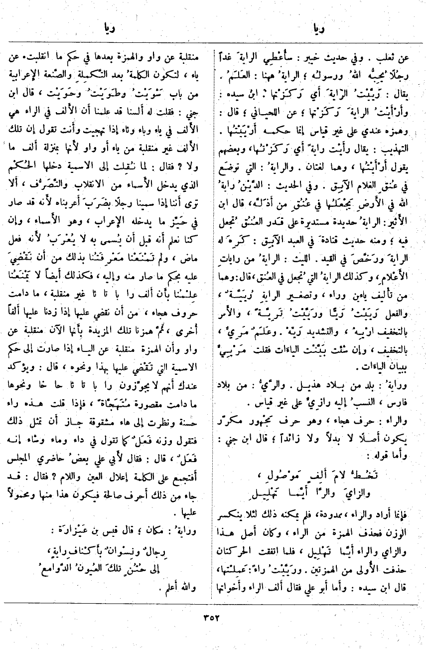 فإِنما أَراد وَالرَّاءَ، مَمْدُودَةً، فَلَمْ يُمْكِنْهُ ذَلِكَ لِئَلَّا يَنْكَسِرَ الْوَزْنُ فَحَذَفَ الْهَمْزَةَ مِنَ الرَّاءِ، وَكَانَ أَصل هَذَا وَالزَّايَ وَالرَّاءَ أَيَّما تَهْلِيل، فَلَمَّا اتَّفَقَتِ الْحَرَكَتَانِ حُذِفَتِ الأُولى مِنَ الْهَمْزَتَيْنِ. ورَيَّيْتُ رَاءً: عَمِلْتها، قَالَ ابْنُ سِيدَهْ: وأَما أَبو عَلِيٍّ فَقَالَ أَلف الرَّاءِ وأَخواتها مُنْقَلِبَةٌ عَنْ وَاوٍ وَالْهَمْزَةُ بَعْدَهَا فِي حُكْمِ مَا انقلبتْ عَنْ يَاءٍ، لِتَكُونَ الكلمةُ بَعْدَ التَّكمِلةِ والصَّنعة الإِعرابية مِنْ بَابِ شَوَيْتُ وطَوَيْتُ وحَوَيْت، قَالَ ابْنُ جِنِّي، فَقُلْتُ لَهُ أَلسنا قَدْ عَلِمْنَا أَن الأَلف فِي الرَّاءِ هِيَ الأَلف فِي يَاءٍ وَبَاءٍ وَثَاءٍ إِذا تَهَجَّيْتَ وأَنت تَقُولُ إِن تِلْكَ الأَلف غَيْرُ مُنْقَلِبَةٍ مِنْ يَاءٍ أَو وَاوٍ لأَنها بِمَنْزِلَةِ أَلف مَا وَلَا؟ فَقَالَ: لَمَّا نُقِلت إِلى الِاسْمِيَّةِ دَخَلَهَا الحُكْم الَّذِي يَدْخُلُ الأَسماء مِنَ الِانْقِلَابِ والتَّصَرُّف، أَلا تَرَى أَننا إِذا سَمَّيْنَا رَجُلًا بضَرَبَ أَعربناه لأَنه قَدْ صَارَ فِي حَيِّز مَا يَدْخُلُهُ الإِعراب، وَهُوَ الأَسماء، وإِن كُنَّا نَعْلَمُ أَنه قَبْلَ أَن يُسمى بِهِ لَا يُعْرَبُ لأَنه فِعْلٌ مَاضٍ، وَلَمْ تَمْنَعْنا مَعْرِفَتُنا بِذَلِكَ مِنْ أَن نَقْضِيَ عَلَيْهِ بِحُكْمِ مَا صَارَ مِنْهُ وإِليه، فَكَذَلِكَ أَيضاً لَا يَمْنَعُنا عِلْمُنا بأَن ألف رَا بَا تَا ثَا غَيْرُ مُنْقَلِبَةٍ، مَا دَامَتْ حُرُوفَ هِجَاءٍ، مِنْ أَن نَقْضِيَ عَلَيْهَا إِذا زِدْنَا عَلَيْهَا أَلفاً أُخرى، ثمَّ هَمَزْنَا تِلْكَ الْمَزِيدَةَ بأَنها الْآنَ مُنْقَلِبَةٌ عَنْ وَاوٍ وأَن الْهَمْزَةَ مُنْقَلِبَةٌ عَنِ الْيَاءِ إِذا صَارَتْ إِلى حُكْمِ الِاسْمِيَّةِ الَّتِي تَقْضي عَلَيْهَا بِهَذَا وَنَحْوِهِ، قَالَ: وَيُؤَكِّدُ عِنْدَكَ أَنهم لَا يجوِّزون رَا بَا تَا ثَا حَا خَا وَنَحْوَهَا مَا دَامَتْ مَقْصُورَةً مُتَهَجَّاةً، فإِذا قُلْتَ هَذِهِ رَاءٌ حَسَنَةٌ وَنَظَرْتَ إِلى هَاءٍ مَشْقُوقَةٍ جَازَ أَن تُمَثِّلَ ذَلِكَ فَتَقُولُ وَزْنُهُ فَعَلٌ كَمَا تَقُولُ فِي دَاءٍ وَمَاءٍ وَشَاءٍ إِنه فَعَلٌ، قَالَ: فَقَالَ لأَبي عَلِيٍّ بعضُ حَاضِرِي الْمَجْلِسِ أَفتجمع عَلَى الْكَلِمَةِ إِعلال الْعَيْنِ وَاللَّامِ؟ فَقَالَ: قَدْ جَاءَ مِنْ ذَلِكَ أَحرف صَالِحَةٌ فَيَكُونُ هَذَا مِنْهَا وَمَحْمُولًا عَلَيْهَا. ورايةُ: مَكَانٌ؛ قَالَ قَيْسُ بْنُ عَيْزارَة: