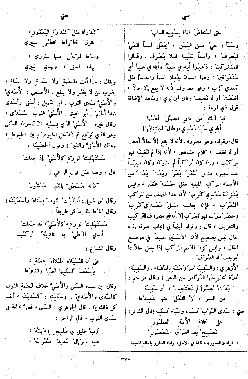 قَالَ: وَقَوْلُهُ، وَهُوَ مَصْرُوفٌ لأَنه لَا يقع إلا حالا أَضفت أَو لَمْ تُضِفْ، كَلَامٌ مُتَنَاقِضٌ، لأَنه إِذَا لَمْ تُضِفْه فَهُوَ مُرَكَّبٌ، وَإِذَا كَانَ مُرَكباً لَمْ ينَوّن وَكَانَ مَبْنِيًّا عِنْدَ سِيبَوَيْهِ مِثْلَ شَغَرَ بَغَرَ وبَيْتَ بَيْتَ مِنَ الأَسماء الْمُرَكَّبَةِ الْمَبْنِيَّةِ مِثْلَ خَمْسةَ عَشَر، وليس بمَنْزِلَة مَعْدِيكَرِبَ لأَن هَذَا الصِّنْفَ مِنَ الْمُرَكَّبِ المُعْرَب، فَإِنْ جَعَلْتَهُ مثلَ مَعْدِيكَرِبَ وحَضْرَمَوْت فَهُوَ مُعْرَب إِلَّا أَنه غَيْرُ مَصْرُوفٍ لِلتَّرْكِيبِ وَالتَّعْرِيفِ، قَالَ: وَقَوْلُهُ أَيضاً فِي إِيجَابِ صَرْفِهِ إِنَّهُ حَالٌ لَيْسَ بِصَحِيحٍ لأَن الاسْمَين جَمِيعًا فِي مَوْضِعِ الْحَالِ، وَلَيْسَ كَوْنُ الِاسْمِ الْمُرَكَّبِ إِذَا جُعِلَ حَالًا مِمَّا يُوجِبُ لَهُ الصَّرْفَ. الأَزهري: والسّبِيَّة اسمُ رَمْلَةٍ بالدَّهناء. والسَّبِيَّة: دُرَّة يُخْرِجُها الغَوَّاص مِنَ الْبَحْرِ؛ وَقَالَ مُزَاحِمٌ: