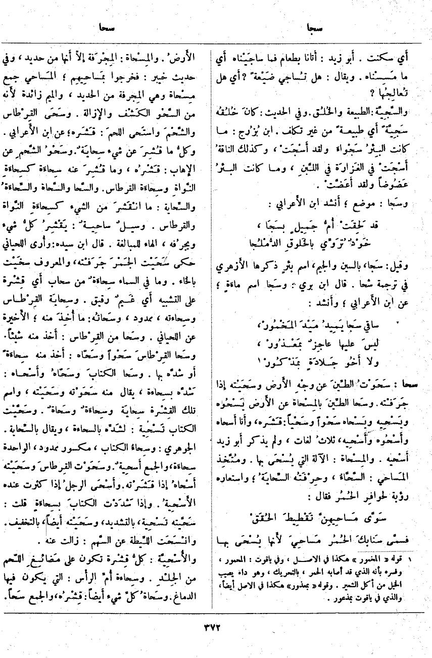 ؛ المَسَاحِي جَمْعُ مِسْحَاة وَهِيَ المِجرفة مِنَ الْحَدِيدِ، وَالْمِيمُ زَائِدَةٌ لأَنه مِنَ السَّحْو الكَشْف والإِزالة. وسَحَى القِرْطاس والشَّحْمَ واسْتَحَى اللحمَ: قَشَرة؛ عَنِ ابْنِ الأَعرابي. وكلُّ مَا قُشِرَ عن شيء سِحايَةٌ. وسَحْوُ الشَّحمِ عَنِ الإِهاب: قَشْرُه، وَمَا قُشِرَ عَنْهُ سِحاءَة كسِحاءَةِ النَّواةِ وسِحاءَة الْقِرْطَاسِ. والسَّحا والسَّحاة والسِّحاءَةُ والسِّحاية: مَا انْقَشَر مِنَ الشَّيْءِ كسِحاءَةِ النَّواة وَالْقِرْطَاسِ. وسيلٌ ساحِيةٌ: يَقْشِرُ كلُّ شَيْءٍ ويجرُفه، الْهَاءُ لِلْمُبَالَغَةِ. قَالَ ابْنُ سِيدَهْ: وأُرى اللِّحْيَانِيُّ حَكَى سَحَيْت الجَمْرَ جَرَفْته، وَالْمَعْرُوفَ سخَيْت بِالْخَاءِ. وَمَا فِي السَّمَاءِ سِحاءَةٌ مِنْ سَحَابٍ أَي قِشْرة عَلَى التَّشْبِيهِ أَي غَيمٌ رَقِيقٌ. وسِحايَة القِرْطاس وسِحَاءته، مَمْدُودٌ، وسَحاتُه: مَا أُخِذَ مِنْهُ؛ الأَخيرة عَنِ اللِّحْيَانِيُّ. وسَحا مِنَ القِرْطاس: أَخذ مِنْهُ شَيْئًا. وسَحَا القِرْطاسَ سَحْواً وسَحّاه: أَخذ مِنْهُ سِحاءَةً أَو شدَّة بِهَا. وسَحا الكتابَ وسَحَّاهُ وأَسْحَاه: شَدَّه بسِحاءة، يُقَالُ مِنْهُ سَحَوْته وسَحَيْته، وَاسْمُ تِلْكَ الْقِشْرَةِ سِحَايَة وسِحاءَةٌ وسَحَاةٌ. وسَحَّيْت الْكِتَابَ تَسْحِيَة: لشدِّه بِالسَّحَّاءَةِ، وَيُقَالُ بالسِّحاية. الْجَوْهَرِيُّ: وسِحاءُ الْكِتَابِ، مَكْسُورٌ مَمْدُودٌ، الْوَاحِدَةُ سِحاءَة، وَالْجَمْعُ أَسحِيةٌ. وسَحَوْت القِرطاسَ وسَحَيْته أَسْحاهُ إِذَا قَشَرْته. وأَسْحَى الرجلُ إِذَا كَثُرَتْ عِنْدَهُ الأَسْحِيةُ. وَإِذَا شَدَدْت الكتابَ بسِحاءَةٍ قُلْتُ: سَحَّيته تَسْحِية، بِالتَّشْدِيدِ، وسَحَيْته أَيضاً، بِالتَّخْفِيفِ. وانْسَحَت اللِّيطة عَنِ السَّهم: زَالَتْ عَنْهُ. والأُسْحِيَّة: كلُّ قِشْرة تَكُونُ عَلَى مَضائِغِ اللَّحْمِ مِنَ الجِلْدِ. وسِحاءة أُمِّ الرأْس: الَّتِي يَكُونُ فِيهَا الدِّمَاغُ. وسحاةُ كلِّ شَيْءٍ أَيضاً: قِشرُه، وَالْجَمْعُ سَحاً.