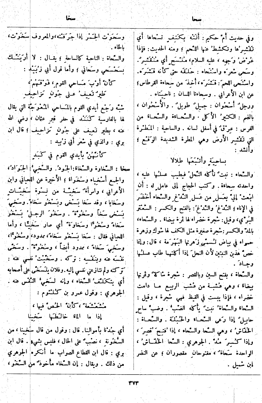 والسِّحَاء: نبتٌ تأْكله النَّحلُ فَيَطِيبُ عسلُها عَلَيْهِ، وَاحِدَتُهُ سِحَاءَة. وَكَتَبَ الْحَجَّاجُ إِلَى عاملٍ لَهُ: أنِ ابْعثْ إِلَيَّ بعَسلٍ مِنْ عَسلِ النَّدْغِ والسِّحاء أَخضَر فِي الإِناء؛ النَّدْغُ والنِّدْغُ: بِالْفَتْحِ وَالْكَسْرِ: السَّعتر البَرِّي، وَقِيلَ: شَجَرَةٌ خَضْرَاءُ لَهَا ثَمَرَةٌ بيضاءُ. والسِّحَاء، بِالْمَدِّ وَالْكَسْرِ: شَجَرَةٌ صَغِيرَةٌ مِثْلَ الْكَفِّ لَهَا شَوْكٌ وَزَهْرَةٌ حَمْرَاءُ فِي بَيَاضٍ تُسمَّى زَهرتها البَهْرَمة، قَالَ: وَإِنَّمَا خصَّ هَذَيْنِ النَّبْتَيْنِ لأَن النحلَ إِذَا أَكلتهما طَابَ عسلُها وجادَ. والسَّحَاة، بِفَتْحِ السِّينِ وَبِالْقَصْرِ: شَجَرَةٌ شاكةٌ وَثَمَرَتُهَا بيضاءُ، وَهِيَ عُشبة مِنْ عُشب الرَّبِيعِ مَا دَامَتْ خَضْرَاءَ، فَإِذَا يَبِسَتْ فِي الْقَيْظِ فَهِيَ شَجَرَةٌ، وَقِيلَ: السِّحَاءُ والسَّحَاةُ نبتٌ يأْكله الضَّبُّ. وضبٌّ سَاحٍ حابِلٌ إِذَا رَعى السِّحاءَ والحُبْلَة. والسَّحَاة: الخُفّاشُ، وَهِيَ السَّحَا والسِّحَاء، إِذَا فُتِحَ قُصِرَ، وَإِذَا كُسِرَ مُدَّ. الْجَوْهَرِيُّ: السَّحَا الخُفّاشُ، الْوَاحِدَةُ سَحَاةٌ، مفتوحانِ مَقْصُورَانِ؛ عَنِ النَّضْرِ إبن شُمَيْلٍ. وسَحَوْت الجَمْر إِذَا جَرَفْته، وَالْمَعْرُوفُ سَخَوْت، بِالْخَاءِ. والسَّحَاة: النَّاحِيَةُ كالساحةِ؛ يُقَالُ: لَا أَرَيَنَّك بسَحْسَحي وسَحَاتي؛ وأَما قَوْلُ أَبي زُبَيْد: