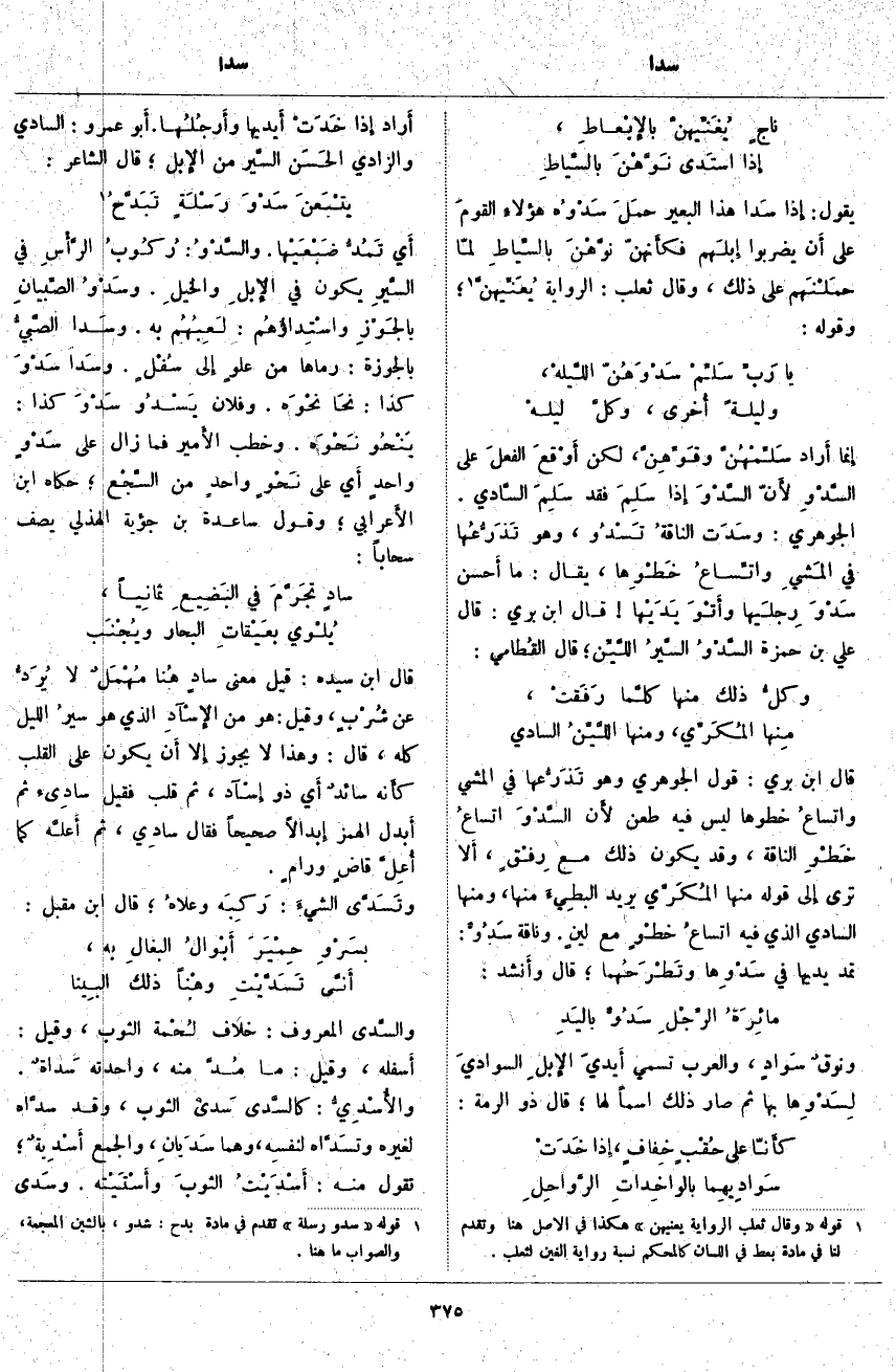 قَالَ ابْنُ سِيدَهْ: قِيلَ مَعْنَى سادٍ هُنا مُهْمَلٌ لَا يُرَدُّ عَنْ شُرْبٍ، وَقِيلَ: هُوَ مِنَ الإِسْآدِ الَّذِي هُوَ سيرُ اللَّيْلِ كُلِّهِ، قَالَ: وَهَذَا لَا يَجُوزُ إِلَّا أَن يَكُونَ عَلَى الْقَلْبِ كأَنه سائدٌ أَي ذُو إسْآد، ثم قلب فقيل سادِئ ثُمَّ أَبدل الْهَمْزَ إَبْدَالًا صحيحا فقال سادِي، ثم أعلَّه كَمَا أُعِلَّ قاضٍ ورامٍ. وتَسَدَّى الشيءَ: رَكِبَه وعلاهُ؛ قَالَ ابْنُ مُقْبِلٍ: