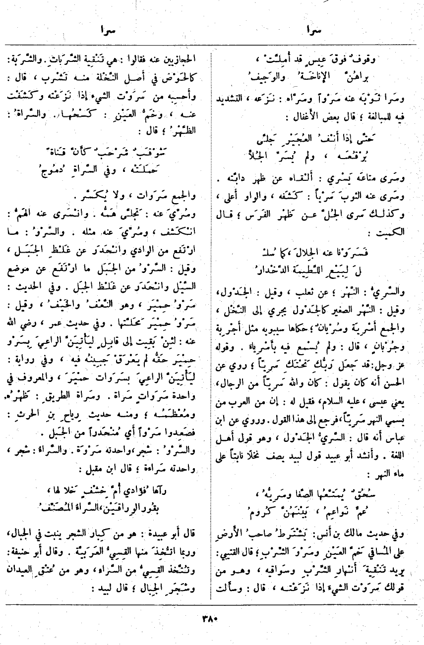 ؛ قَالَ الْقُتَيْبِيُّ: يُرِيدُ تَنْقِيةَ أَنْهارِ الشِّرْبِ وسَواقيه، وَهُوَ مِنْ قَوْلِكَ سَرَوْت الشَّيْءَ إِذَا نَزَعْته، قَالَ: وسأَلت الْحِجَازِيِّينَ عَنْهُ فَقَالُوا: هِيَ تَنْقِية الشَّرَبات. والشَّرَبة: كالحَوْض فِي أَصل النَّخْلة مِنْهُ تَشْرب، قَالَ: وأَحسِبه مِنْ سَرَوْت الشَّيْءَ إِذَا نَزَعْته وكَشَفْت عَنْهُ، وخَمُّ العَيْنِ: كَسْحُها. والسَّراةُ: الظَّهْرُ؛ قَالَ: