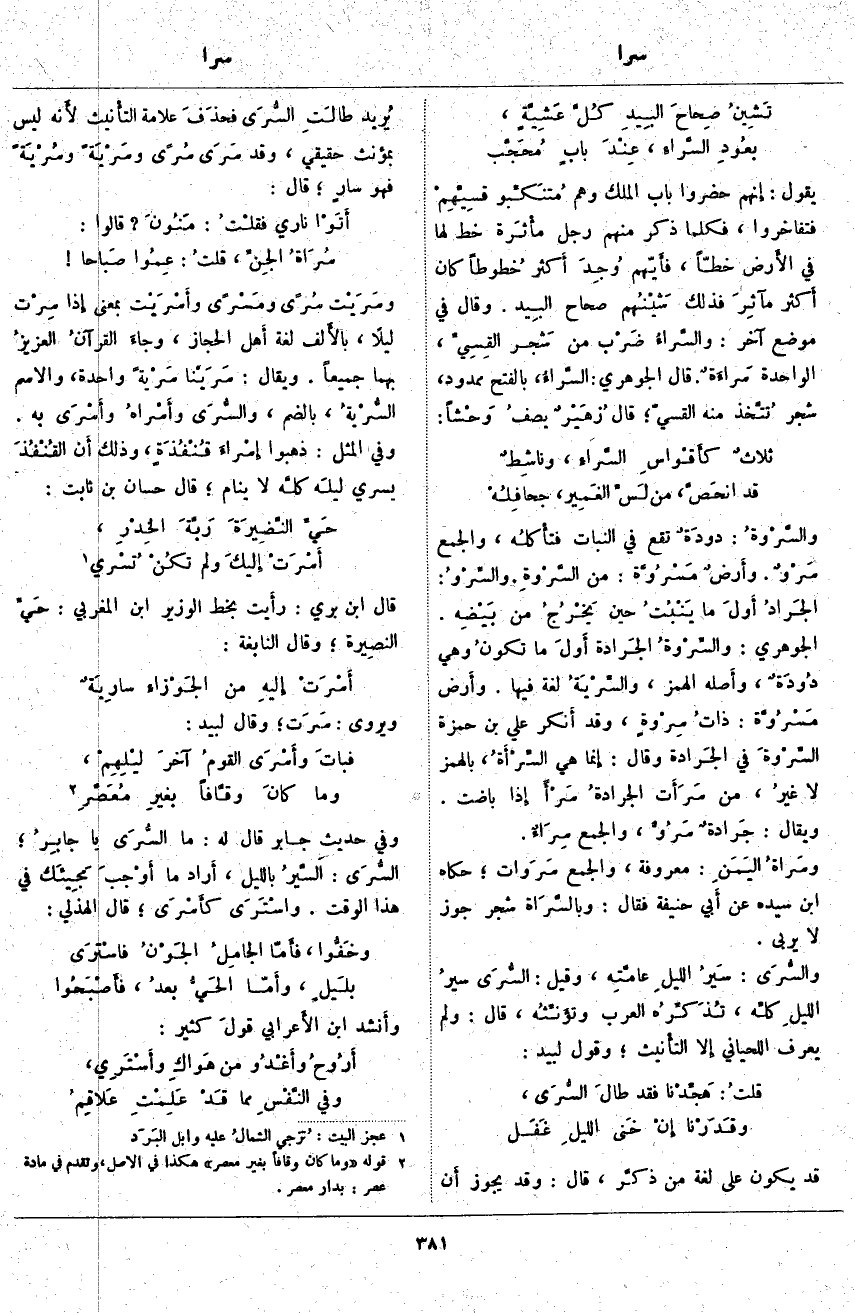 وسَرَيْت سُرىً ومَسْرىً وأَسْرَيْت بِمَعْنَى إِذَا سِرْت لَيْلًا، بالأَلف لُغَةُ أَهل الْحِجَازِ، وجاءَ القرآنُ العزيزُ بِهِمَا جَمِيعًا. وَيُقَالُ: سَرَيْنا سَرْيةً وَاحِدَةً، وَالِاسْمُ السُّرْيةُ، بِالضَّمِّ، والسُّرَى وأَسْراهُ وأَسْرَى بِهِ. وَفِي الْمَثَلِ: ذَهَبُوا إسْراءَ قُنْفُذَةٍ، وَذَلِكَ أَنَّ القُنْفُذَ يَسْرِي ليلَه كلَّه لَا يَنَامُ؛ قَالَ حَسَّانُ بْنُ ثَابِتٍ: