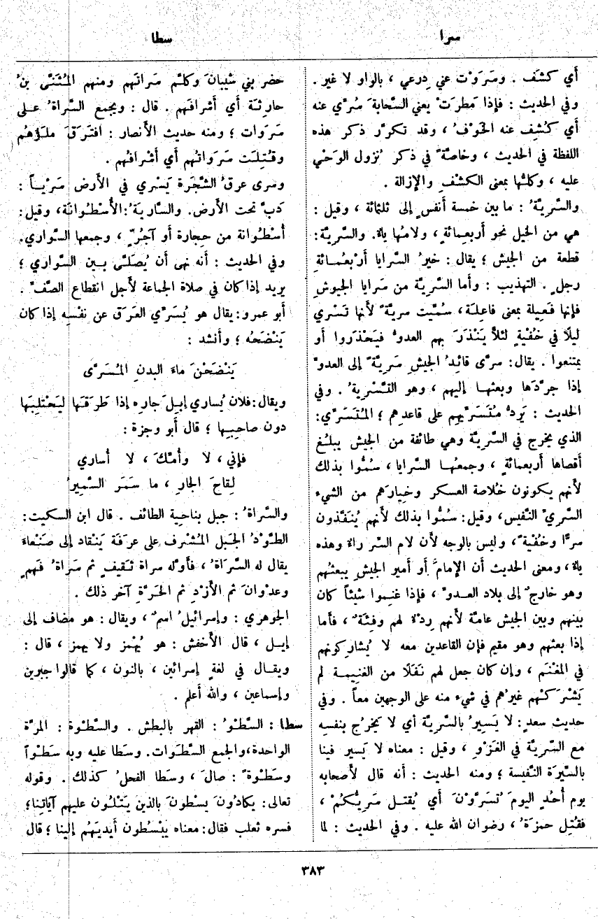 أَي أَشْرافُهم. وسَرَى عرقُ الشَّجَرة يَسْرِي فِي الأَرض سَرْياً: دَبَّ تَحْتَ الأَرض. والسَّارِيَةُ: الأُسْطُوانَة، وَقِيلَ: أُسْطُوانة مِنْ حِجارة أَو آجُرٍّ، وَجَمْعُهَا السَّوَارِي. وَفِي الْحَدِيثِ:
