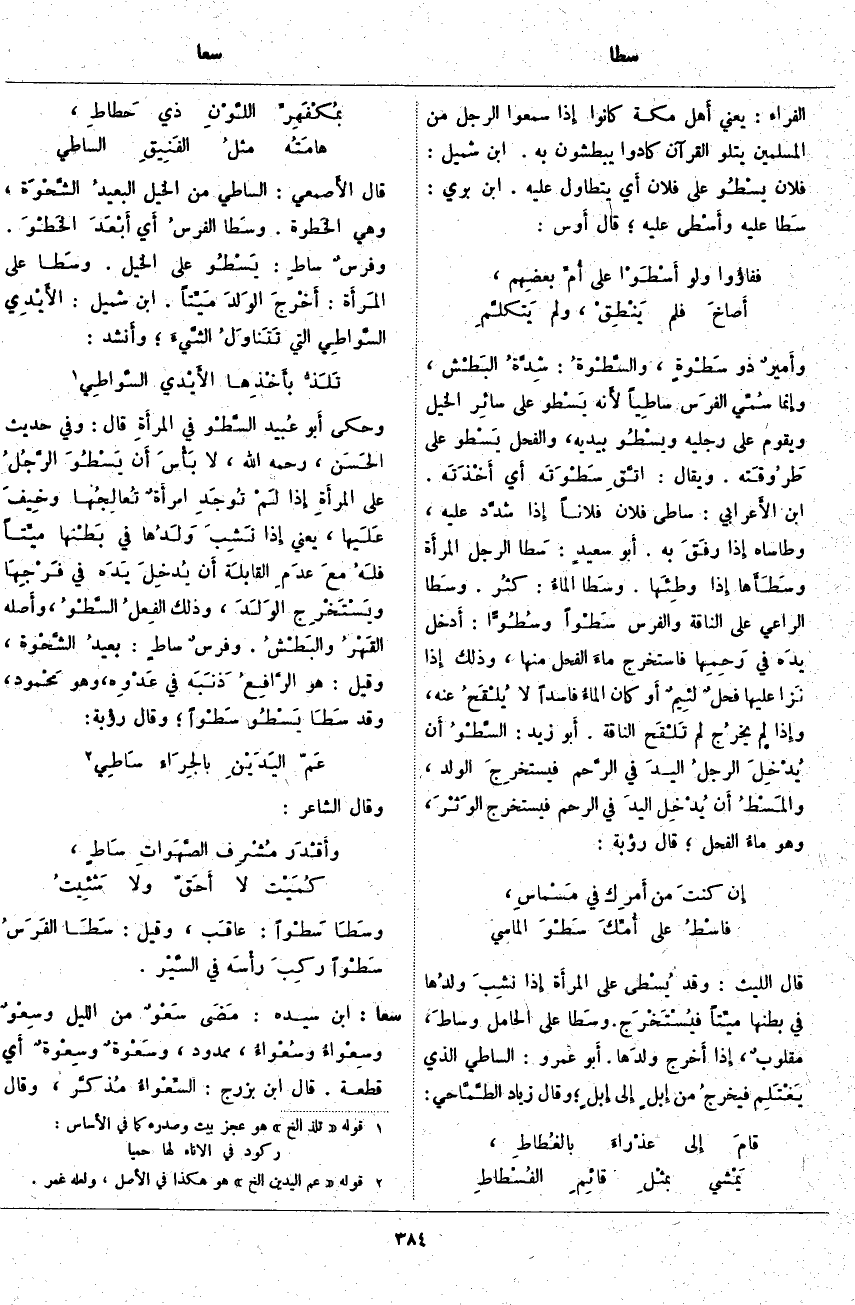 وأَميرٌ ذُو سَطْوةٍ، والسَّطْوةُ: شِدَّةُ البَطْش، وَإِنَّمَا سُمِّي الفرَس ساطِياً لأَنه يَسْطو عَلَى سائِر الْخَيْلِ وَيَقُومُ عَلَى رجليه ويسْطُو بِيَدَيْهِ، وَالْفَحْلُ يَسْطو عَلَى طَرُوقَته. وَيُقَالُ: اتَّقِ سَطْوَتَه أَي أَخْذَتَه. ابْنُ الأَعرابي: سَاطَى فلان وفلاناً إِذَا شدَّد عَلَيْهِ، وَطَاسَاهُ إِذَا رفَقَ بِهِ. أَبو سعيدٍ: سَطا الرَّجُلُ المرأَة وسَطَأَها إِذَا وطِئَها. وسَطا الماءُ: كثُر. وسَطا الرَّاعِي عَلَى النَّاقَةِ وَالْفَرَسِ سَطْواً وسُطُوّاً: أَدخل يدهَ فِي رَحِمِها فَاسْتَخْرَجَ ماءَ الْفَحْلِ مِنْهَا، وَذَلِكَ إِذَا نَزا عَلَيْهَا فحلٌ لئِيمٌ أَو كَانَ الماءُ فَاسِدًا لَا يُلْقَحُ عَنْهُ، وَإِذَا لَمْ يخرُج لَمْ تَلْقَح النَّاقَةُ. أَبو زَيْدٍ: السَّطْوُ أَن يُدْخِلَ الرجلُ اليدَ فِي الرَّحم فيستخرِجَ الْوَلَدَ، والمَسْطُ أَن يُدْخِل اليدَ فِي الرَّحِمِ فَيُسْتَخْرَجَ الوَثْرَ، وَهُوَ ماءُ الْفَحْلِ؛ قَالَ رُؤْبَةُ: