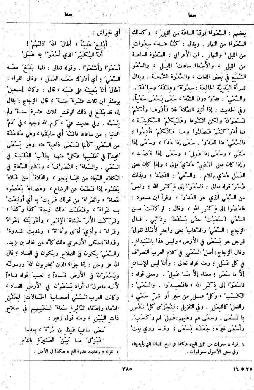 ، وَقَالَ: لَوْ كانَتْ مِنَ السَّعْي لَسَعَيْتُ حَتَّى يَسْقُط رِدَائِي. قَالَ الزَّجَّاجُ: السَّعْيُ والذَّهابُ بِمَعْنًى واحدٍ لأَنّك تقولُ لِلرَّجُلِ هُوَ يَسْعَى فِي الأَرض، وَلَيْسَ هَذَا باشْتِدادٍ. وَقَالَ الزَّجَّاجُ: أَصلُ السَّعْيِ فِي كَلَامِ الْعَرَبِ التصرُّف فِي كُلِّ عَمَلٍ؛ وَمِنْهُ قَوْلُهُ تَعَالَى: وَأَنْ لَيْسَ لِلْإِنْسانِ إِلَّا مَا سَعى
