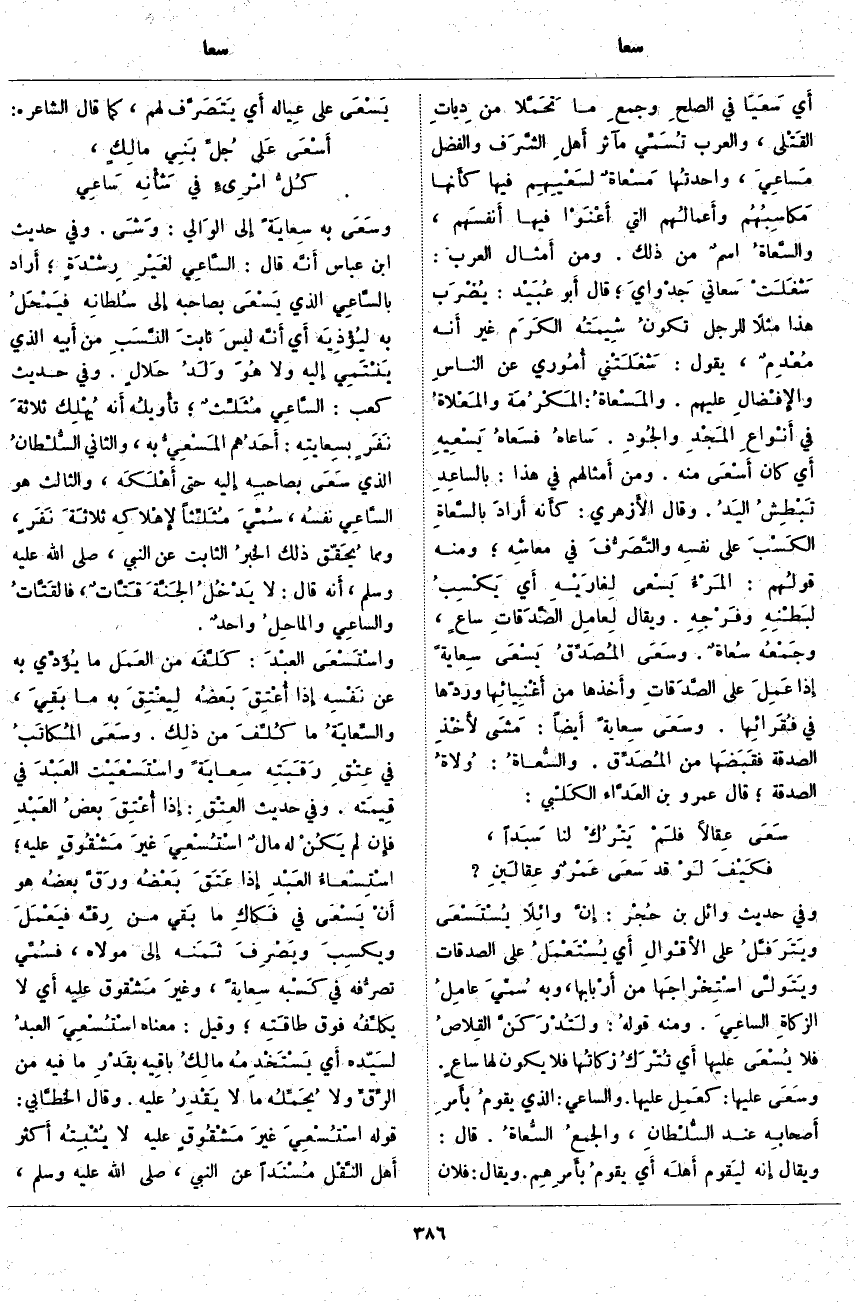 أَي سَعَيَا فِي الصلحِ وجمعِ مَا تَحَمَّلا مِنْ دِياتِ القَتْلى، وَالْعَرَبُ تُسَمِّي مَآثِرَ أَهلِ الشَّرَف وَالْفَضْلِ مَساعِيَ، واحدتُها مَسْعاةٌ لسَعْيِهِم فِيهَا كأَنها مَكاسِبُهُم وأَعمالُهم الَّتِي أَعْنَوْا فِيهَا أَنفسَهم، والسَّعاةُ اسمٌ مِنْ ذَلِكَ. وَمِنْ أَمثال الْعَرَبِ: شَغَلَتْ سَعاتي جَدْوايَ؛ قَالَ أَبو عُبَيْد: يُضْرَب هَذَا مَثَلًا لِلرَّجُلِ تكونُ شِيمَتُه الكَرَم غَيْرَ أَنه مُعْدِمٌ، يَقُولُ: شَغَلَتْني أُمُوري عَنِ الناسِ والإِفْضالِ عَلَيْهِمْ. والمَسْعاةُ: المَكْرُمَة والمَعْلاةُ فِي أَنْواعِ المَجْدِ والجُودِ. سَاعاهُ فسَعاهُ يَسْعِيهِ أَيْ كَانَ أَسْعَى مِنْهُ. وَمِنْ أَمثالهم فِي هَذَا: بالساعِدِ تَبْطِشُ اليَدُ. وَقَالَ الأَزهري: كأَنه أَرادَ ب السَّعاةِ الكَسْبَ عَلَى نفسهِ والتَّصَرُّفَ فِي معاشهِ؛ وَمِنْهُ قولُهم: المَرْءُ يَسْعى لِغارَيْه أَي يَكْسِبُ لبَطْنِهِ وفَرْجِهِ. وَيُقَالُ لِعامِل الصَّدَقاتِ ساعٍ، وجَمْعُه سُعاةٌ. وسَعى المُصَدِّقُ يَسْعَى سِعايةً إِذَا عَمِلَ عَلَى الصَّدقاتِ وأَخذها مِنْ أَغْنِيائِها وَرَدَّهَا فِي فُقَرائِها. وسَعَى سِعايةً أَيضاً: مَشى لأَخْذِ الصَّدَقَةِ فقَبَضَها مِنَ المُصَدِّق. والسُّعاةُ: وُلاةُ الصَّدَقَةِ؛ قَالَ عَمْرُو بْنُ العَدَّاء الكَلْبي: