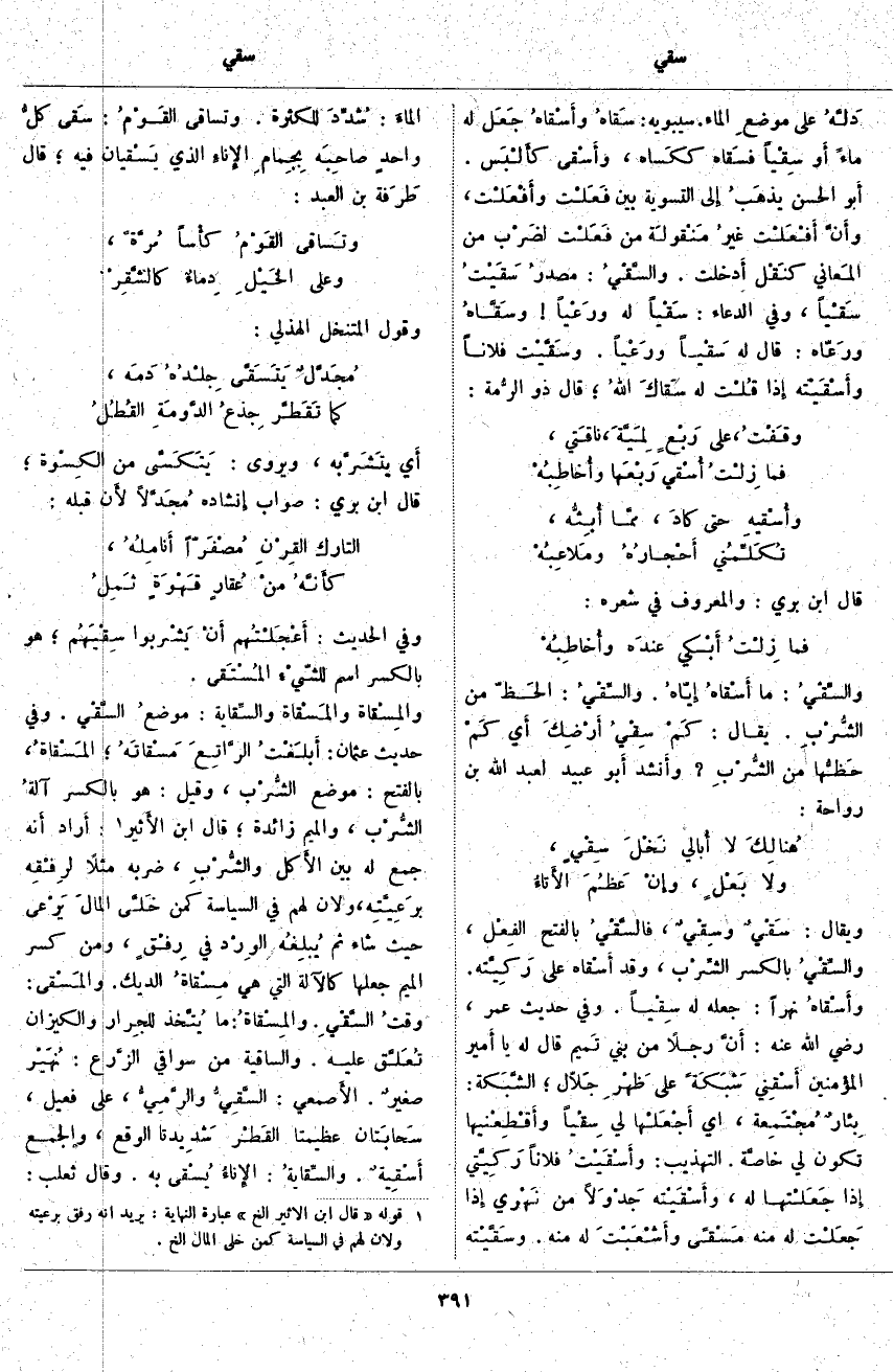 دَلَّهُ عَلَى موضعِ الْمَاءِ. سيبويه: سَقَاهُ وأَسْقَاهُ جَعَل لَهُ مَاءً أَوْ سِقْياً فسَقاه ككسَاه، وأَسْقَى كأَلْبَس. أَبو الْحَسَنِ يذهَبُ إِلَى التَّسْوِيَةِ بَيْنَ فَعَلْت وأَفْعَلْت، وأَنَّ أَفْعَلْت غيرُ مَنْقولَة مِنْ فَعَلْت لضَرْب مِنَ المَعاني كنَقْل أَدخلت. والسَّقْيُ: مصدرُ سَقَيْتُ سَقْياً، وَفِي الدُّعَاءِ: