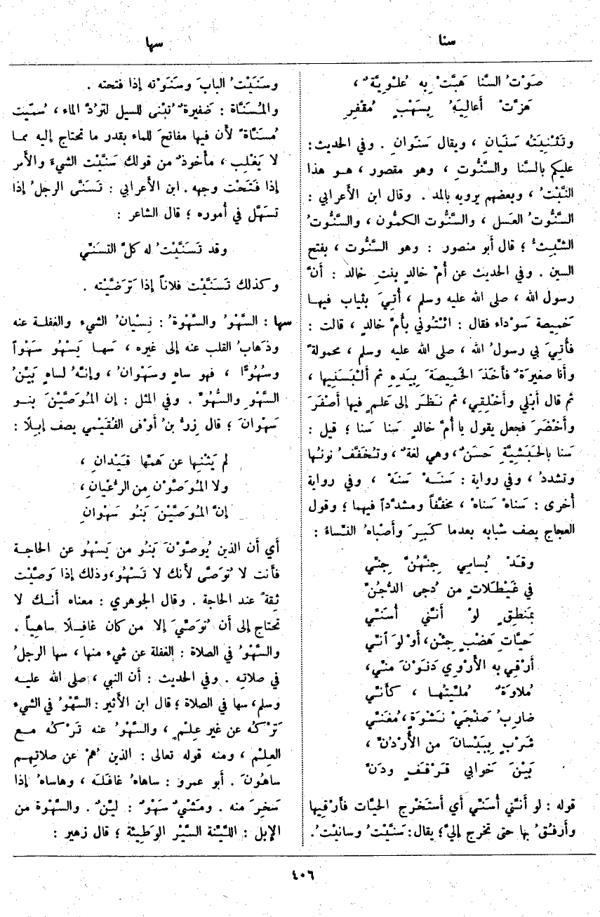 سها: السَّهْوُ والسَّهْوةُ: نِسْيانُ الشَّيْءِ وَالْغَفْلَةُ عَنْهُ وذَهابُ الْقَلْبِ عَنْهُ إِلَى غَيْرِهِ، سَهَا يَسْهُو سَهْواً وسُهُوّاً، فَهُوَ سَاهٍ وسَهْوَانُ، وإنَّهُ لسَاهٍ بَيِّنُ السَّهْوِ والسُّهُوِّ. وَفِي الْمَثَلِ: إِنَّ المُوَصَّيْنَ بَنُو سَهْوَانَ؛ قَالَ زِرُّ بنُ أَوْفى الفُقَيْمي يَصِفُ إبِلًا: