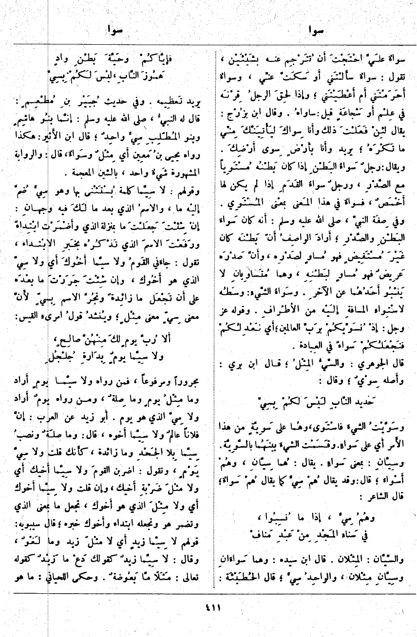 ؛ أَرادَ الواصِفُ أَنّ بَطْنَه كَانَ غَيْرَ مُسْتَفِيضٍ فَهُوَ مُساوٍ لصَدْرِه، وأَنَّ صَدْرَه عَرِيضٌ فَهُوَ مُسَاوٍ لبَطْنِهِ، وَهُمَا مُتَسَاوِيَانِ لَا ينْبُو أَحَدُهُما عَنِ الآخرِ. وسَواءُ الشَّيءِ: وسَطُه لاسْتِواءِ المسافةِ إلَيْه مِنَ الأَطْرافِ. وَقَوْلُهُ عَزَّ وَجَلَّ: إِذْ نُسَوِّيكُمْ بِرَبِّ الْعالَمِينَ