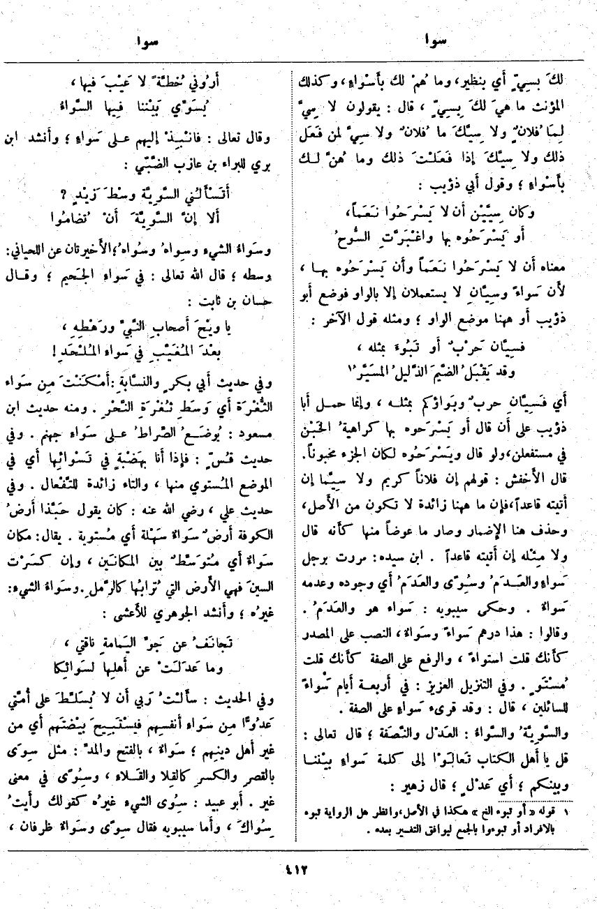 . أَي فَسِيَّانِ حربٌ وبَواؤكم بِمِثْلِهِ، وَإِنَّمَا حَمَلَ أَبا ذُؤَيْبٍ عَلَى أَن قَالَ أَو يَسْرَحوه بِهَا كراهيةُ الخَبْن فِي مُسْتَفْعِلِنْ، وَلَوْ قَالَ ويَسْرَحُوه لَكَانَ الْجُزْءُ مَخْبُونًا. قَالَ الأَخفش: قَوْلُهُمْ إِنَّ فُلَانًا كَرِيمٌ وَلَا سِيّما إِنْ أَتيته قَاعِدًا، فَإِنَّ مَا هَاهُنَا زَائِدَةٌ لَا تَكُونُ مِنَ الأَصل، وَحُذِفَ هُنَا الإِضمار وَصَارَ مَا عِوَضًا مِنْهَا كأَنه قَالَ وَلَا مِثْله إِنْ أَتيته قَاعِدًا. ابْنُ سِيدَهْ: مَرَرْتُ بِرَجُلٍ سَواءٍ والعَدَمُ وسُوىً [سِوىً] والعَدَمُ أَي وُجُودُهُ وَعَدَمُهُ سَواءٌ. وَحَكَى سِيبَوَيْهِ: سَواء هُوَ والعَدَمُ. وَقَالُوا: هَذَا دِرْهَمٌ سَواءً وسَوَاءٌ، النَّصْبُ عَلَى الْمَصْدَرِ كأَنك قُلْتَ اسْتِوَاءً، وَالرَّفْعُ عَلَى الصِّفَةِ كَأَنَّكَ قُلْتَ مُسْتَوٍ. وَفِي التَّنْزِيلِ الْعَزِيزِ: فِي أَرْبَعَةِ أَيَّامٍ سَواءً لِلسَّائِلِينَ