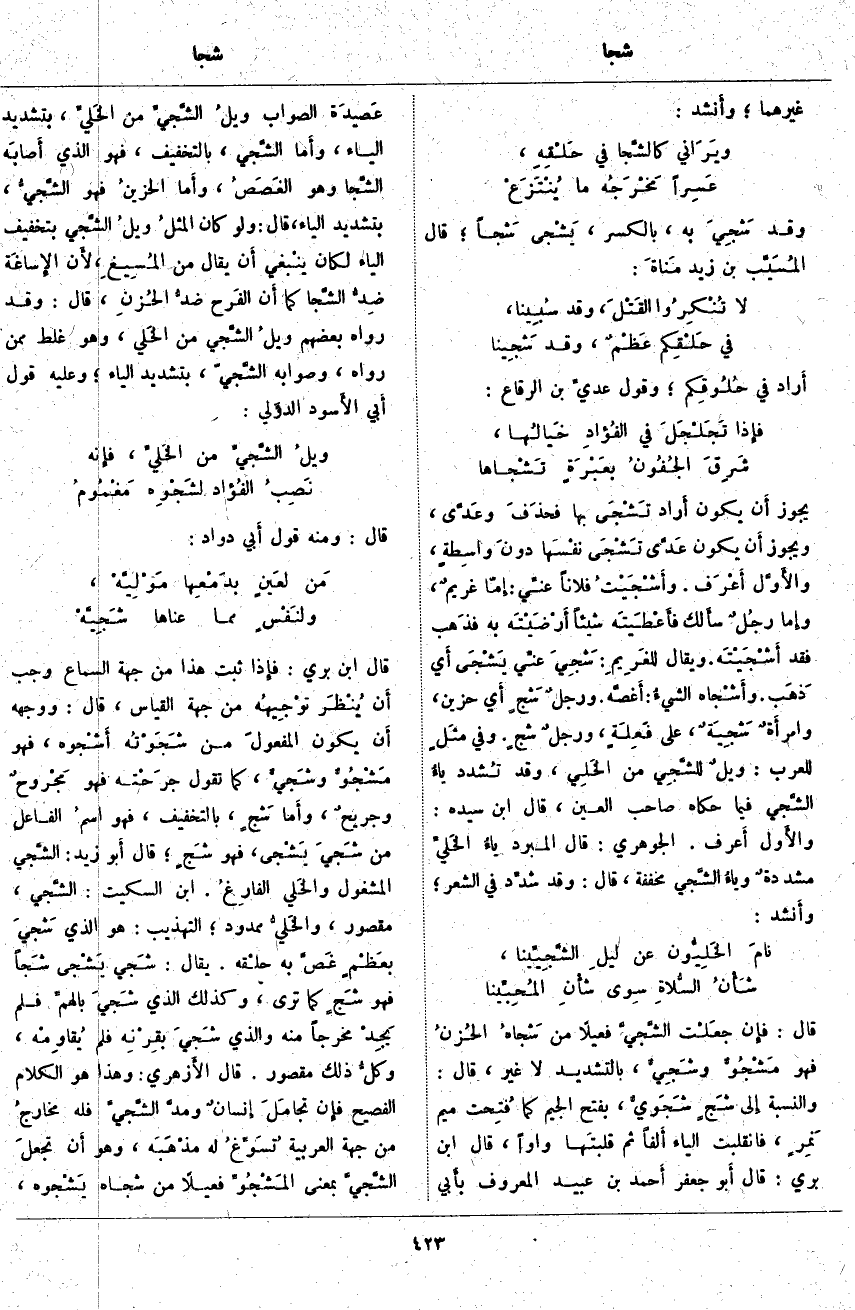 يَجُوزُ أَن يَكُونَ أَراد تَشْجَى بِهَا فحذَفَ وعَدَّى، وَيَجُوزُ أَن يَكُونَ عَدَّى تَشْجَى نفْسَها دونَ واسِطةٍ، والأَوَّل أَعْرَف. وأَشْجَيْتُ فُلَانًا عنِّي: إِمَّا غريمٌ، وَإِمَّا رجُلٌ سأَلك فأَعْطَيتَه شَيْئًا أَرْضَيْتَه بِهِ فذَهب فَقَدْ أَشْجَيْتَه. وَيُقَالُ للغَرِيمِ: شَجِيَ عنِّي يَشْجَى أَيْ ذَهَب. وأَشْجَاه الشيءُ: أَغصَّه. ورجلٌ شَجٍ أَي حَزِينٌ، وامرأَةٌ شَجِيَةٌ، عَلَى فَعِلَةٍ، ورجلٌ شجٍ. وَفِي مثَلٍ لِلْعَرَبِ: ويلٌ للشَّجِي مِنَ الخَلِي، وَقَدْ تُشدد ياءُ الشَّجي فِيمَا حَكَاهُ صَاحِبُ الْعَيْنِ، قَالَ ابْنُ سِيدَهْ: والأَول أَعرف. الْجَوْهَرِيُّ: قَالَ الْمُبَرِّدُ ياءُ الخَليِّ مشددةٌ وياءُ الشَّجي مُخَفَّفَةٌ، قَالَ: وَقَدْ شدِّد فِي الشِّعْرِ؛ وأَنشد:
