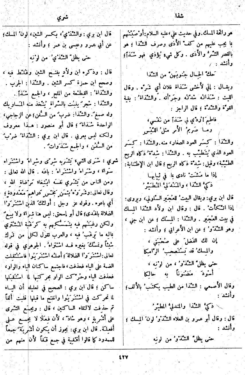 شري: شَرى الشيءَ يَشْرِيه شِرىً وشِرَاءً واشْتَرَاه سَواءٌ، وشَرَاهُ واشْتَرَاهُ: باعَه. قَالَ اللَّهُ تَعَالَى: وَمِنَ النَّاسِ مَنْ يَشْرِي نَفْسَهُ ابْتِغاءَ مَرْضاتِ اللَّهِ