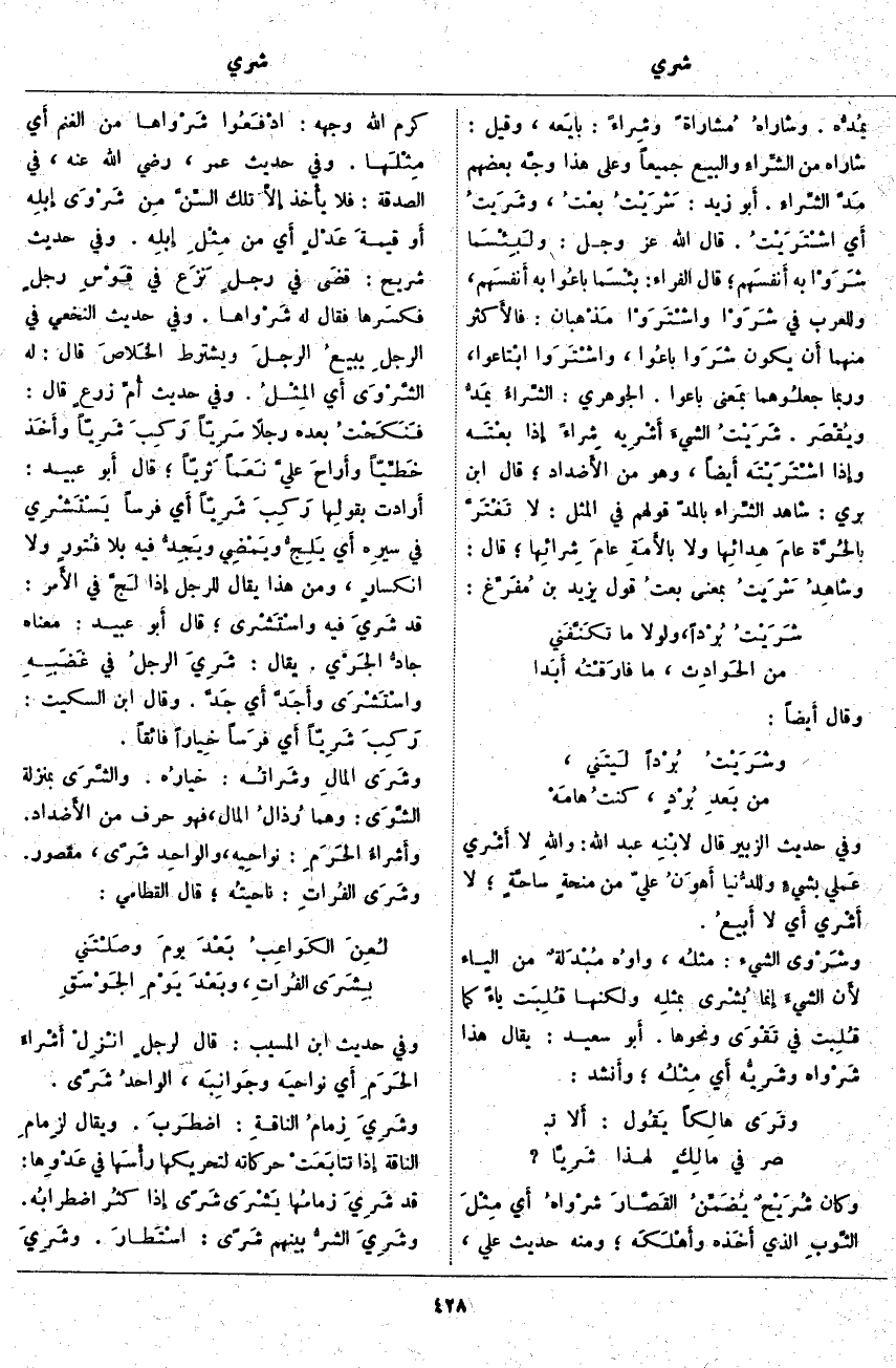 ؛ قَالَ الْفَرَّاءُ: بئْسَما باعُوا بِهِ أَنفسَهم، وَلِلْعَرَبِ فِي شَرَوْا واشْتَرَوْا مَذْهبان: فالأَكثر مِنْهُمَا أَن يَكُونَ شَرَوا باعُوا، واشْتَرَوا ابْتاعوا، وَرُبَّمَا جعلُوهما بمَعنى بَاعُوا. الْجَوْهَرِيُّ: الشِّرَاءُ يمَدُّ ويُقْصَر. شَرَيْتُ الشيءَ أَشْرِيه شِرَاءً إِذَا بعْتَه وَإِذَا اشْتَرَيْتَه أَيضاً، وَهُوَ مِنَ الأَضداد؛ قَالَ ابْنُ بَرِّيٍّ: شَاهِدُ الشِّرَاء بِالْمَدِّ قَوْلُهُمْ فِي الْمَثَلِ: لَا تَغْتَرَّ بالحُرَّة عامَ هِدائِها وَلَا بالأَمَةِ عامَ شِرائِها؛ قَالَ: وشاهِدُ شَرَيتُ بِمَعْنَى بعتُ قَوْلُ يَزِيدَ بْنِ مُفَرِّغ: