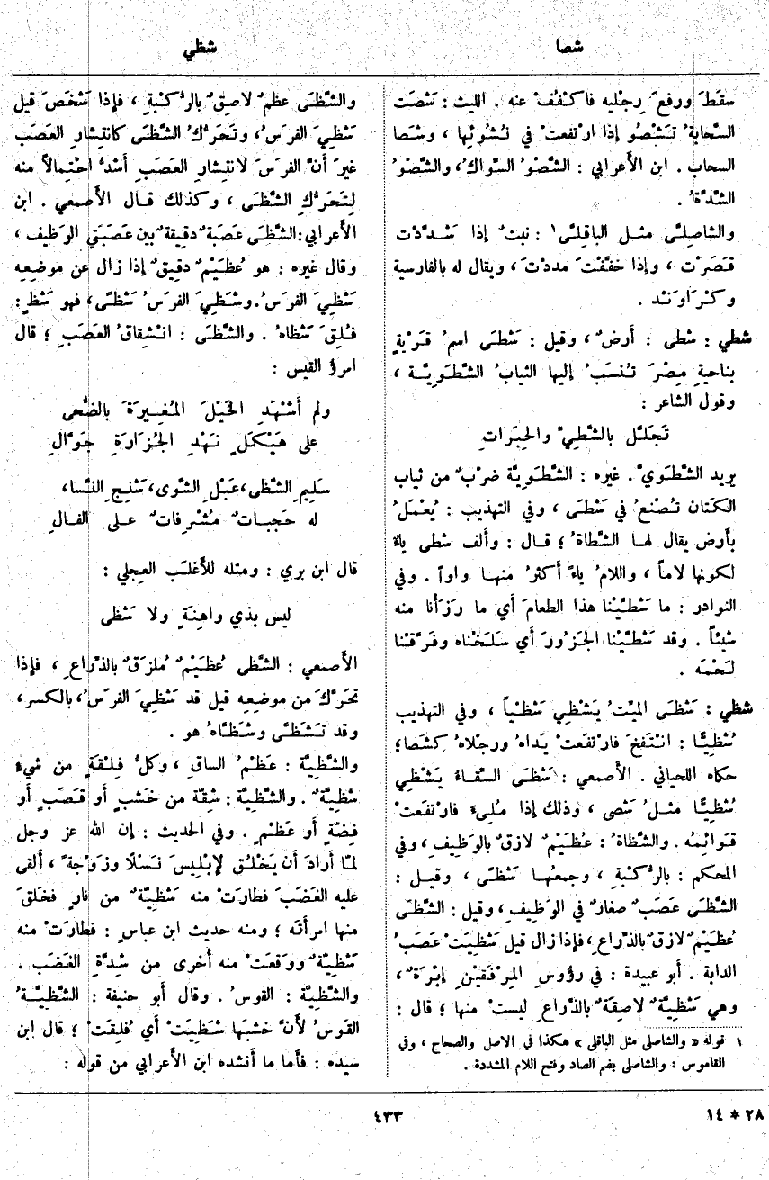 شطي: شَطَى: أَرضٌ، وَقِيلَ: شَطَى اسمُ قَرْيةٍ بناحيةِ مِصْرَ تُنسَبُ إِلَيْهَا الثيابُ الشَّطَوِيَّة، وَقَوْلُ الشَّاعِرِ: