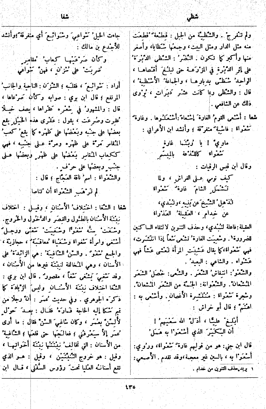 شغا: الشَّغا: اخْتِلافُ الأَسْنانِ، وَقِيلَ: اخْتِلَافُ نِبْتَة الأَسْنان بالطُّول والقِصَر والدُّخُول والخُروج. وشَغَتْ سِنُّه شُغُوّاً وشَغِيَتْ شَغىً ورجلٌ أَشْغَى وامرأَة شَغْوَاءُ وشَغْيَاءُ مُعاقَبَةٌ، حجازيَّة، وَالْجَمْعُ شُغْوٌ. والسِّنُّ الشَّاغِيَةُ: هِيَ الزائِدَةُ عَلَى الأَسنان، وَهِيَ المُخالفة لنِبْتَة غَيْرِهَا مِنَ الأَسْنان، وَقَدْ شَغِيَ يَشْغى شَغاً، مقصورٌ. قَالَ ابْنُ بَرِّيٍّ: الشَّغا اختِلاف نِبْتَة الأَسْنانِ وليسَ الزِّيَادَة كَمَا ذكرَه الْجَوْهَرِيُّ. وَفِي حَدِيثِ