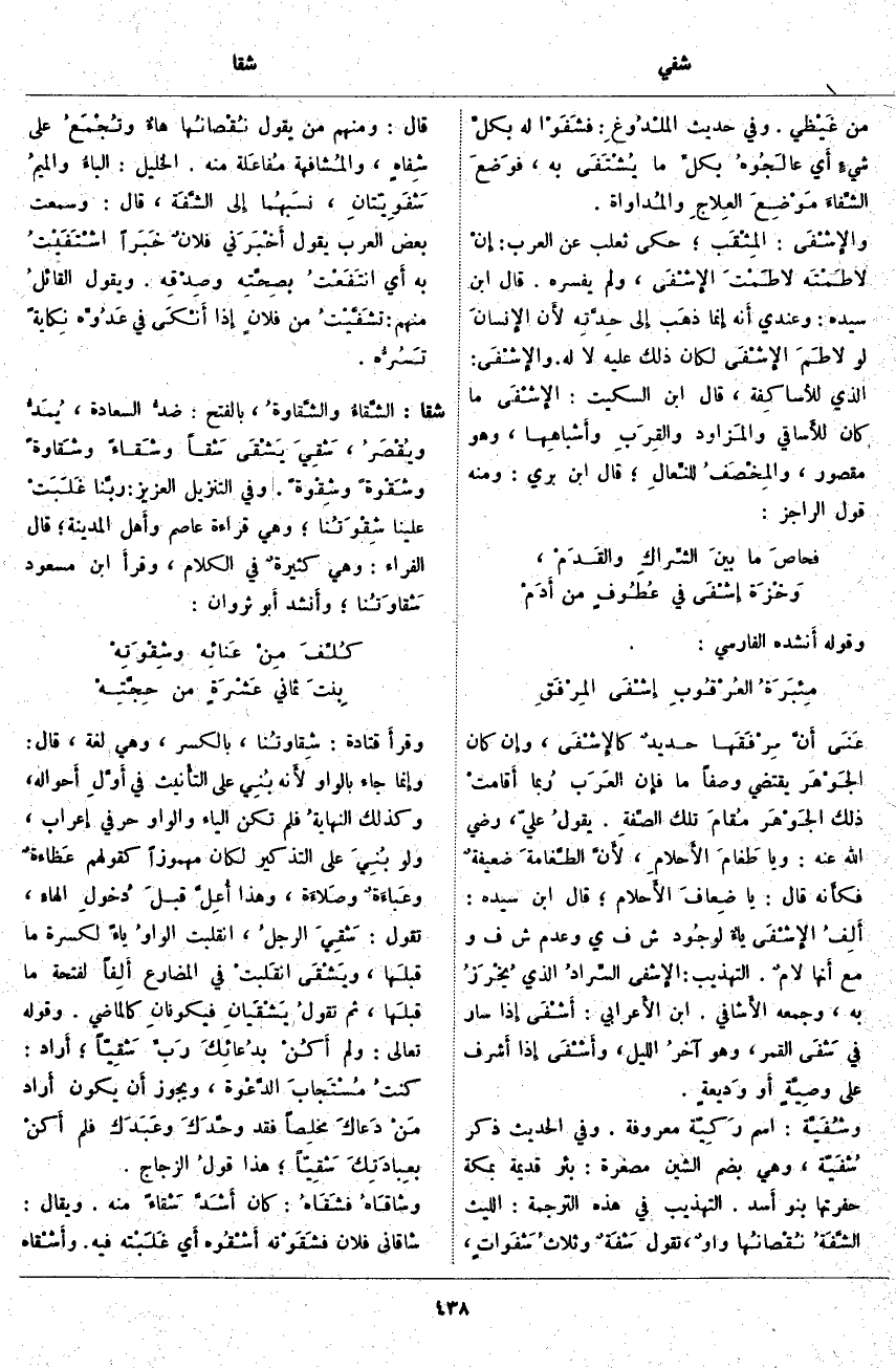شقا: الشَّقاءُ والشَّقَاوَةُ، بِالْفَتْحِ: ضدُّ السَّعَادَةِ، يُمَدُّ ويُقْصَرُ، شَقِيَ يَشَقَى شَقاً وشَقاءً وشَقَاوةً وشَقْوةً وشِقْوَةً. وَفِي التَّنْزِيلِ الْعَزِيزِ: رَبَّنا غَلَبَتْ عَلَيْنا شِقْوَتُنا