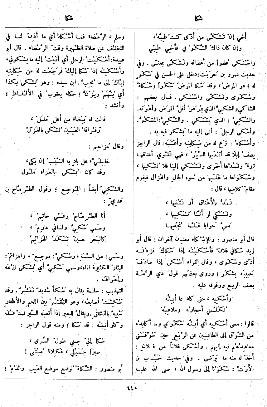 ؛ هُوَ المرضُ، وَقَدْ شَكا المرضَ شَكْواً وشَكَاةً وشَكْوى وتَشَكَّى واشْتَكى. قَالَ بَعْضُهُمْ: الشَّاكِي والشَّكِيُّ الَّذِي يمْرَضُ أَقلَّ المرَض وأَهْوَنه. والشَّكِي: الَّذِي يَشْتَكي. والشَّكِيُّ: المشكُوُّ. وأَشْكَى الرجلَ: أَتى إِليه مَا يَشْكو فِيهِ بِهِ. وأَشْكَاهُ: نزَع لَهُ مِنْ شِكايتِه وأَعْتَبَه: قَالَ الرَّاجِزُ يصفُ إِبلًا قَدْ أَتْعَبها السَّيْرُ، فَهِيَ تَلْوي أَعناقها تَارَةً وتَمُدُّها أُخْرى وتَشْتَكي إِلينا فَلَا نُشْكيها، وشَكْواها مَا غَلَبها مِنْ سُوء الحالِ والهُزال فَيَقُومُ مقامَ كلامِها، قَالَ:
