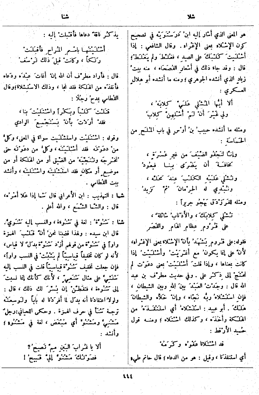 وَقَوْلُهُ: اشْتَليْت واستشْلَيت سواءٌ فِي الْمَعْنَى، وكلُّ منْ دعَوْتَه فَقَدَ أَشْلَيْتَه، وكلُّ مَنْ دعَوْتَه حَتَّى تُخْرِجَه وتُنَجِّيَهُ مِنَ الضِّيق أَو مِنَ الهَلكة أَو مِنْ موضِعٍ أَو مكانٍ فَقَدَ استَشْليتَه واشْتَليتَه، وأَنشد بَيْتَ القُطامي.