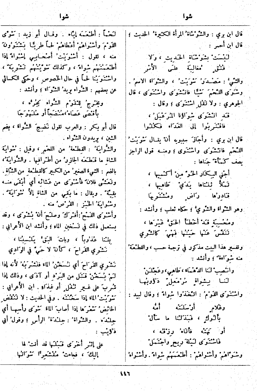 قَالَ أَبو بَكْرٍ: وَالْعَرَبُ تَقُولُ نَضِجَ الشُّوَاءُ، بِضَمِّ الشِّينِ، يُرِيدُونَ الشِّواء. والشُّوَايَةُ: القِطْعةُ مِنَ اللحْمِ، وَقِيلَ: شُوَايَة الشاةِ مَا قَطَعَه الجازِرُ مِنْ أَطْرافِها. والشُّوَايَةُ، بِالضَّمِّ: الشيءُ الصغيرُ مِنَ الْكَبِيرِ كالقِطْعةِ مِنَ الشَّاةِ. وتَعَشَّى فلانٌ ف أَشْوَى مِنْ عَشائِه أَي أَبْقَى مِنْهُ بِقيَّةً. وَيُقَالُ: مَا بَقِي مِنَ الشاةِ إِلَّا شُوَايَةٌ. وشُوَايَةُ الخُبْز: القُرْصُ مِنْهُ. وأَشْوَى القَمْحُ: أَفْرَكَ وصلَحَ أَنْ يُشْوَى، وَقَدْ يُسْتَعْمَلُ ذَلِكَ فِي تَسْخينِ الماءِ؛ وأَنشد ابْنُ الأَعرابي:
