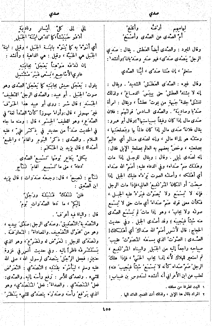 وَقَالَ غَيْرُهُ: الصَّدَى العَطَشُ الشديدُ. وَيُقَالُ: إِنَّهُ لَا يشتدُّ العطشُ حَتَّى ييبَسَ الدماغُ، وَلِذَلِكَ تنشَقُّ جلدةُ جَبهةِ مَنْ يموتُ عَطَشًا، وَيُقَالُ: امرأَة صَدْيا وصادِيَةٌ. والصَّدَى السادسُ قولُهُم: فُلَانٌ صَدَى مَالٍ إِذَا كَانَ رَفِيقًا بسِياسِتها «2»؛ وَقَالَ أَبو عَمْرٍو: يُقَالُ فلانٌ صَدَى مالٍ إِذَا كَانَ عَالِمًا بِهَا وبمَصلحَتِها، ومثلُه هُوَ إزاءُ مالٍ، وإنه ل صَدَى مالٍ أَي عالِمٌ بمصلحتهِ، وخصَّ بَعْضُهُمْ بِهِ الْعَالِمَ بمصلحةِ الإِبل فَقَالَ: إِنَّهُ لصَدَى إبلٍ. وَقَالَ: وَيُقَالُ لِلرَّجُلِ إِذَا مَاتَ وهَلَك صمَّ صَدَاه، وَفِي الدُّعَاءِ عَلَيْهِ: أَصَمَّ اللَّهُ صَدَاه أَي أَهْلكه، وأَصلهُ الصَّوْتُ يَرُدُّه عَلَيْكَ الْجَبَلُ إِذَا صِحْتَ أَو المكانُ المُرْتَفِعُ الْعَالِي، فَإِذَا مَاتَ الرَّجُلُ فَإِنَّهُ لَا يُسْمَع وَلَا يُصَوِّت فيَرُدَّ عَلَيْهِ الْجَبَلُ، فكأَن مَعْنَى قَوْلِهِ صَمَّ صَداهُ أَي مَاتَ حَتَّى لَا يُسْمع صوتهُ وَلَا يجابُ، وَهُوَ إِذَا ماتَ لَمْ يَسْمَع الصَّدى مِنْهُ شَيْئًا فيُجيبَه؛ وَقَدْ أَصْدَى الْجَبَلُ. وَفِي حَدِيثِ