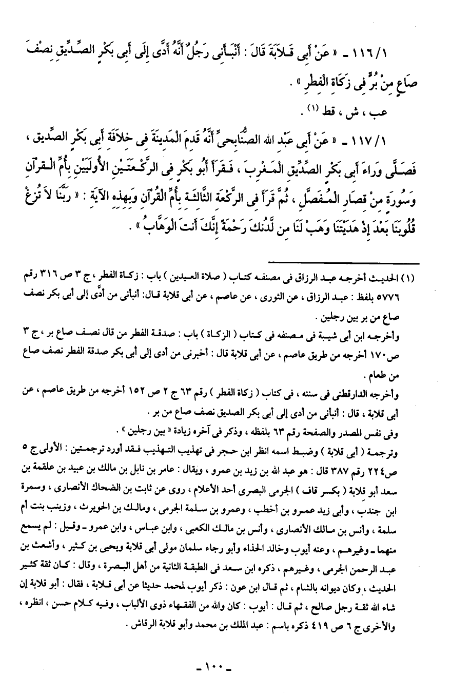 1/ 116 - "عَنْ أبِى قَلَابَةَ قَالَ: أَنْبَأَنِى رَجُلٌ أَنَّهُ أَدَّى إِلَى أبِى بَكْرٍ الصَّدَّيقِ نِصْفَ صَاعٍ مِنْ بُرًّ فِى زَكَاةِ الْفِطْرِ".