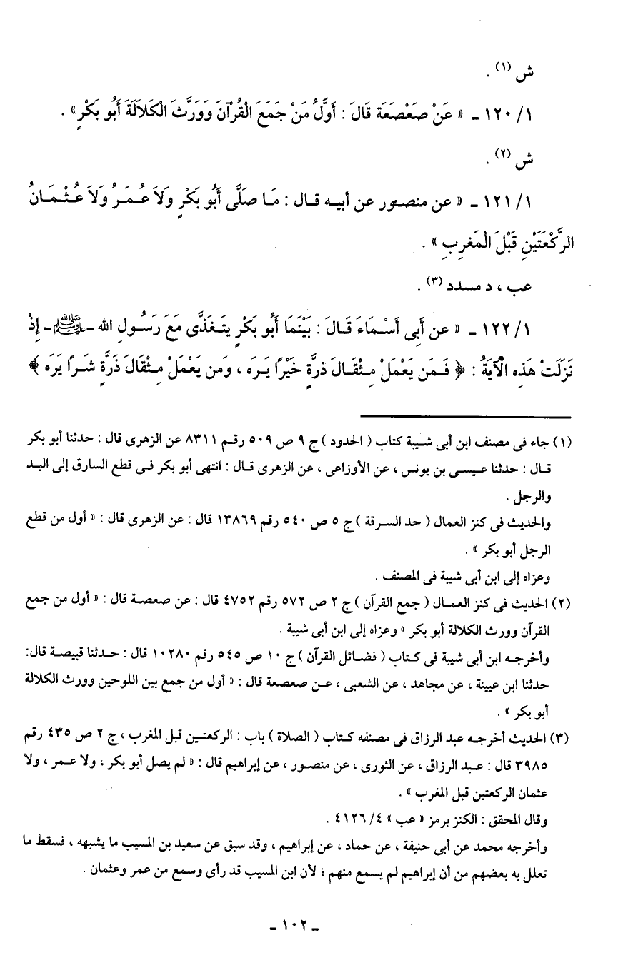 1/ 120 - "عَن صَعْصَعَة قَالَ: أَوَّلُ مَنْ جَمَعَ الْقُرْآنَ وَوَرَّثَ الْكَلَالَةَ أَبُو بَكْرٍ".