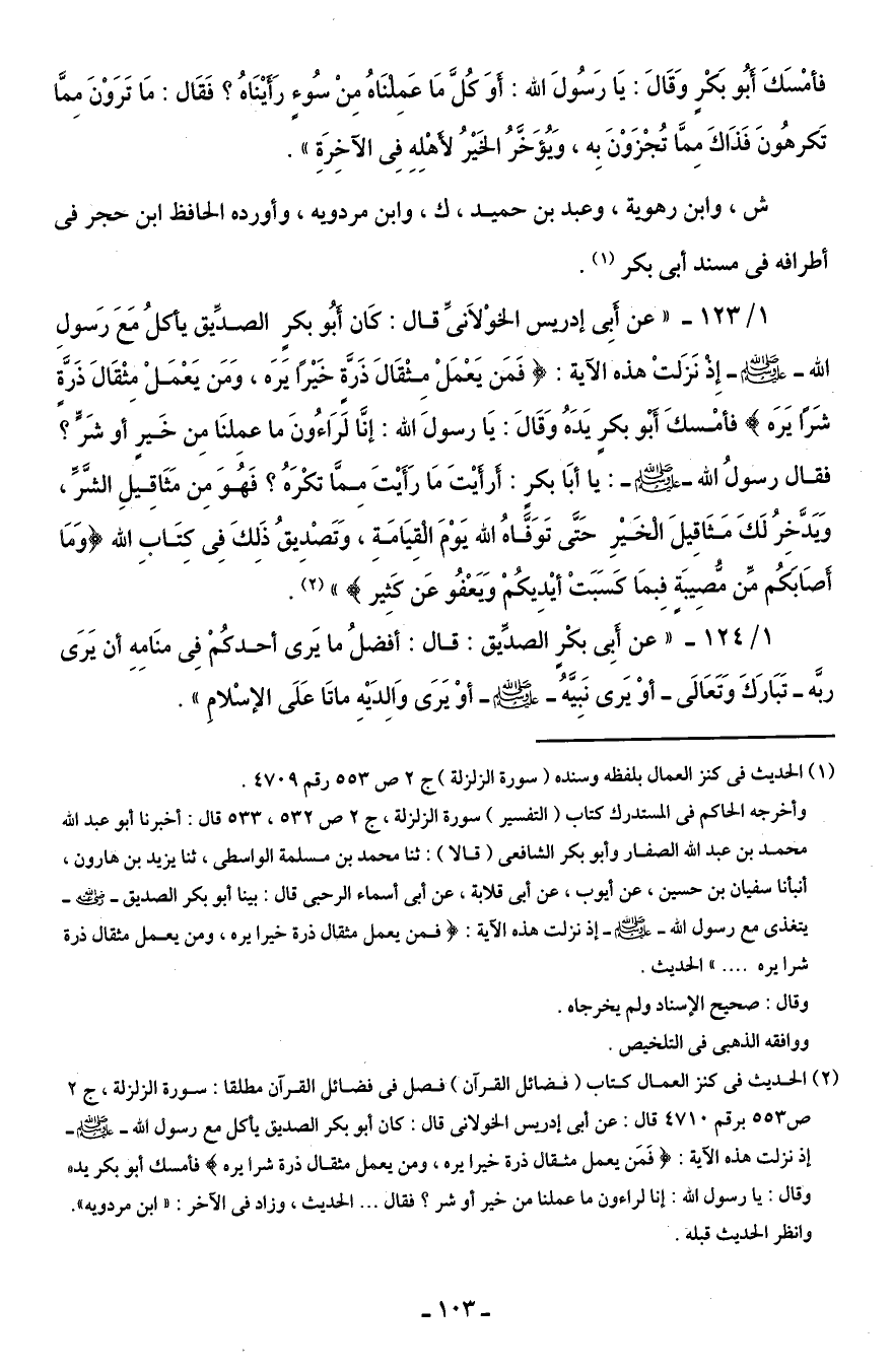 1/ 123 - "عن أَبِى إدريس الخوْلَانىِّ قال: كَان أَبُو بكرٍ الصدِّيق يأكلُ معَ رَسولِ الله - صلى الله عليه وسلم - إِذْ نَزَلتْ هذه الآية: {فَمَنْ يَعْمَلْ مِثْقَالَ ذَرَّةٍ خَيْرًا يَرَهُ (7) وَمَنْ يَعْمَلْ مِثْقَالَ ذَرَّةٍ شَرًّا يَرَهُ} فأمْسكَ أَبو بكرٍ يَدَهُ وَقَالَ: يَا رسولَ الله: إنَّا لَرَاءُونَ ما عمِلنَا مِن خَيرٍ أو شَرٍّ؟ فقال رسولُ الله - صلى الله عليه وسلم -: يا أبَا بكرٍ: أَرأَيْتَ مَا رَأَيْتَ مِمَّا تكْرَهُ؟ فَهُوَ مِن مَثَاقِيلِ الشَّرِّ، وَيدَّخِرُ لَكَ مَثَاقِيلَ الْخَيْرِ حَتَّى تَوَفَّاهُ الله يَوْم الْقِيَامَةِ، وَتَصْدِيقُ ذَلِكَ فِى كتَاب الله {وَمَا أَصَابَكُمْ مِنْ مُصِيبَةٍ فَبِمَا كَسَبَتْ أَيْدِيكُمْ وَيَعْفُو عَنْ كَثِيرٍ} " (¬2).