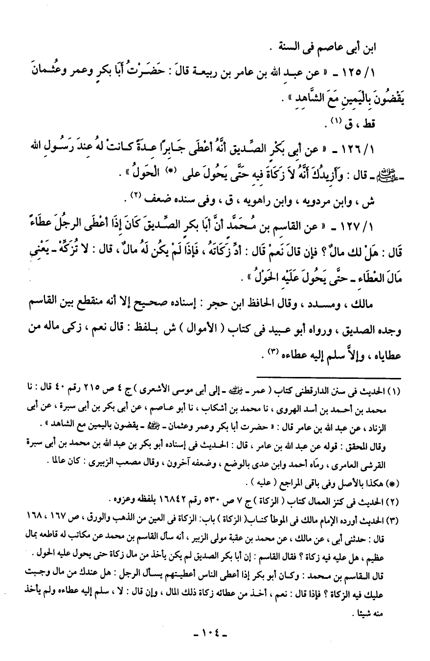 1/ 126 - "عن أبِى بَكْرٍ الصَّديق أنَّهُ أعْطَى جَابِرًا عدَةً كانتْ لهُ عِندَ رَسُولِ الله - صلى الله عليه وسلم - قال: وَأَزِيدُكَ أنَّهُ لَا زَكَاةَ فِيهِ حَتَّى يَحُولَ على (*) الْحَولُ".