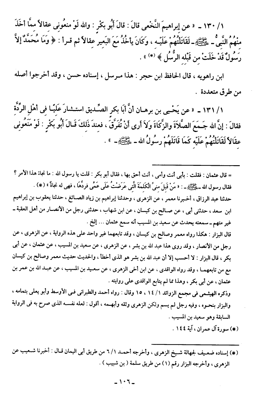 1/ 130 - "عن إِبراهيمَ النَّخْعى قالَ: قالَ أبُو بكْرٍ: والله لَوْ منعُونِى عِقالًا مِمَّا أخَذَ مِنْهُمُ النَّبِىُّ - صلى الله عليه وسلم - لَقَاتَلْتُهُمْ عَلَيْهِ، وَكَانَ يأخُذُ مَعَ البَعِير عِقالًا ثم قرأ: {وَمَا مُحَمَّدٌ إِلَّا رَسُولٌ قَدْ خَلَتْ مِنْ قَبْلِهِ الرُّسُلُ} (*) ".