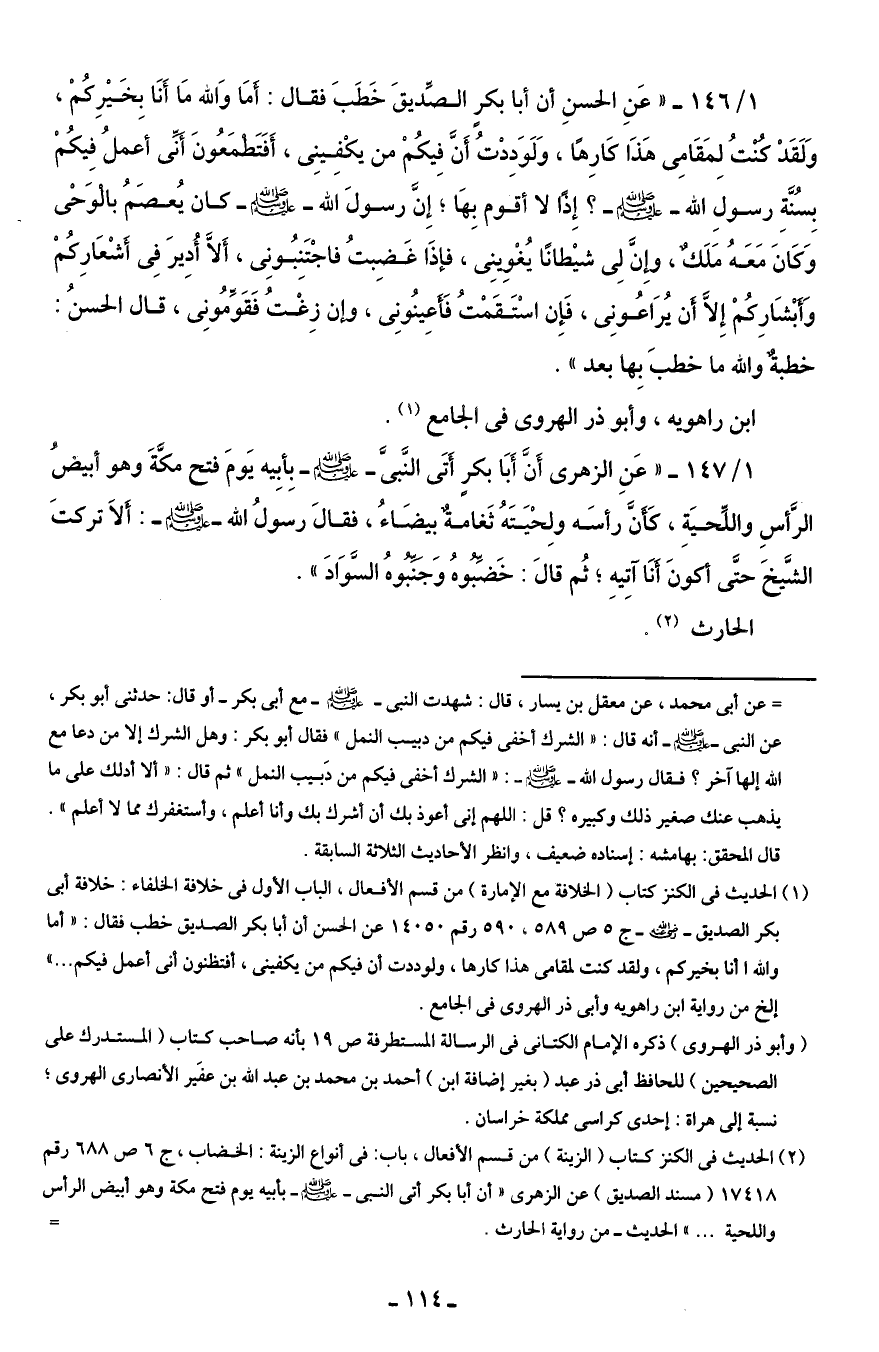 1/ 146 - "عَنِ الحسنِ أن أبا بكرٍ الصَّديقَ خَطَبَ فقال: أمَا وَالله مَا أَنَا بِخَيْرِكُمْ، وَلَقَدْ كُنْتُ لِمَقَامِى هَذَا كَارِهًا، وَلَوَدِدْتُ أَنَّ فِيكُمْ من يكْفِينِى، أَفَتَطْمَعُونَ أَنَّى أعملُ فِيكُمْ بِسُنَّةِ رسولِ الله - صلى الله عليه وسلم -؟ إِذًا لا أقوم بِهَا؛ إِنَّ رسولَ الله - صلى الله عليه وسلم - كان يُعصَمُ بالوحْى وَكَانَ مَعَهُ مَلَكٌ، وإِنَّ لِى شيْطانًا يُغْوِينِى، فإذَا غَضِبتُ فاجْتَنِبُونِى، أَلَّا أُدِيرَ فِى أَشْعَارِكُمْ وَأَبْشَارِكُمْ إِلَّا أَن يُرَاعُونِى، فَإِن اسْتَقَمْتُ فَأَعِينُونِى، وإن زِغْتُ فَقَوِّمُونِى، قال الحسنُ: خطبةٌ والله ما خطبَ بِها بعد".