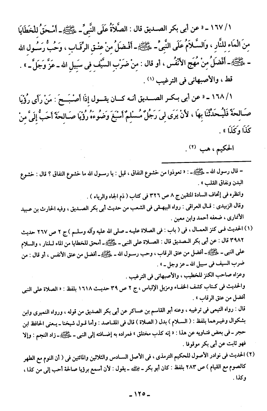 1/ 167 - "عن أبى بكر الصديق قال: الصَّلَاةُ عَلَى النَّبِىِّ - صلى الله عليه وسلم - أَمْحَقُ لِلْخَطَايَا مِنَ الْمَاءِ لِلنَّارِ، وَالسَّلَامُ عَلَى النَّبِىَّ - صلى الله عليه وسلم - أَفْضَلُ مِنْ عِتْقِ الرِّقَابِ, وَحُبُّ رَسُولِ الله - صلى الله عليه وسلم - أَفْضَلُ مِنْ مُهَج الأَنْفُس، أو قال: مِنْ ضَرْبِ السَّيْفِ فِى سَبِيلِ الله - عَزَّ وَجَلَّ -".