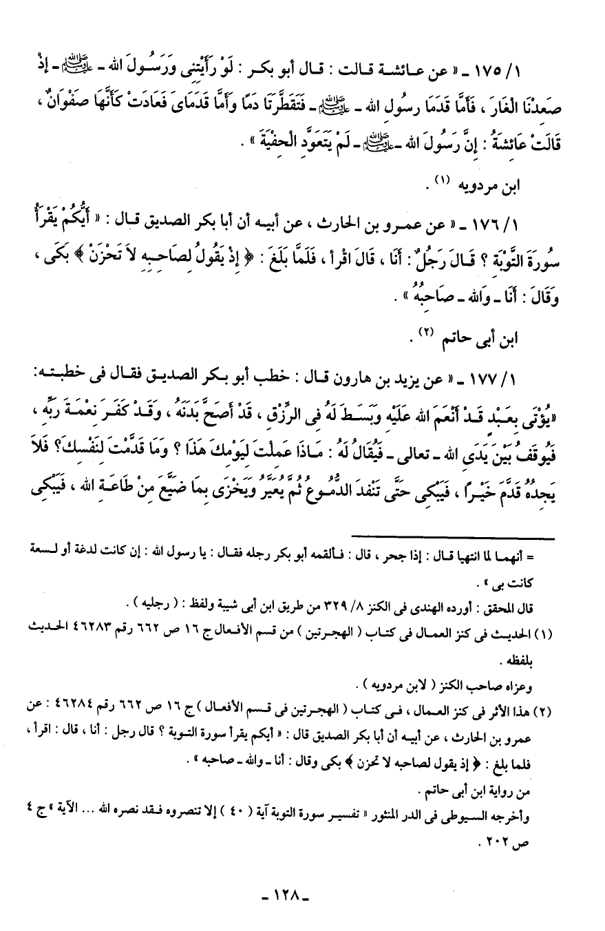 (¬2) هذا الأثر في كنز العمال، في كتاب (الهجرتين في قسم الأفعال) ج 16 ص 662 رقم 46284: عن عمرو بن الحارث، عن أبيه أن أبا بكر الصديق قال: "أيكم يقرأ سورة التوبة؟ قال رجل: أنا، قال: اقرأ، فلما بلغ: {إِذْ يَقُولُ لِصَاحِبِهِ لَا تَحْزَنْ} بكى وقال: أنا - والله - صاحبه".