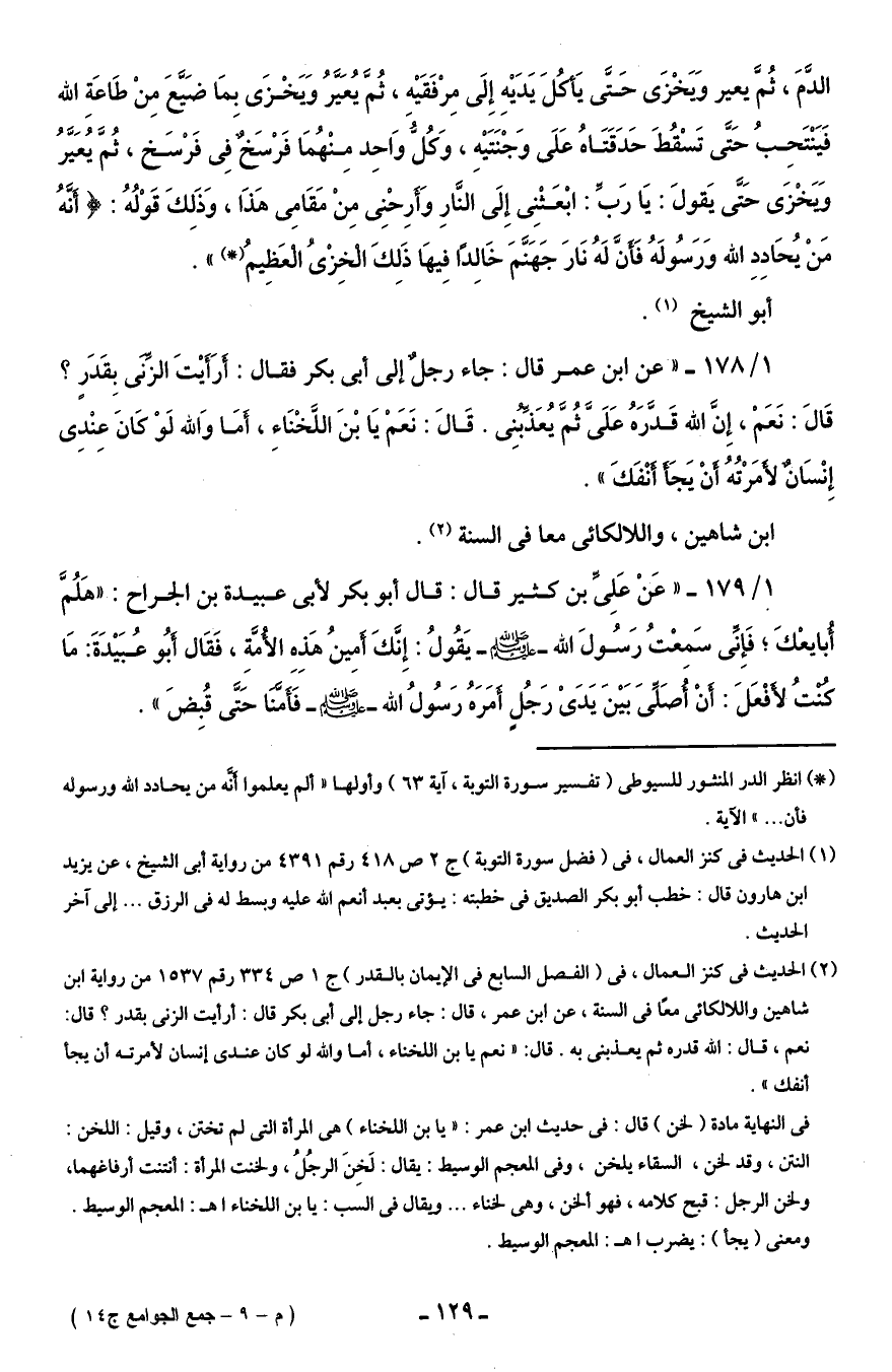 (¬2) الحديث في كنز العمال، في (الفصل السابع في الإيمان بالقدر) ج 1 ص 334 رقم 1537 من رواية ابن شاهين واللالكائى معًا في السنة، عن ابن عمر، قال: جاء رجل إلى أبى بكر قال: أرأيت الزنى بقدر؟ قال: نعم، قال: الله قدره ثم يعذبنى به. قال: "نعم يا بن اللخناء، أما والله لو كان عندى إنسان لأمرته أن يجأ أنفك".