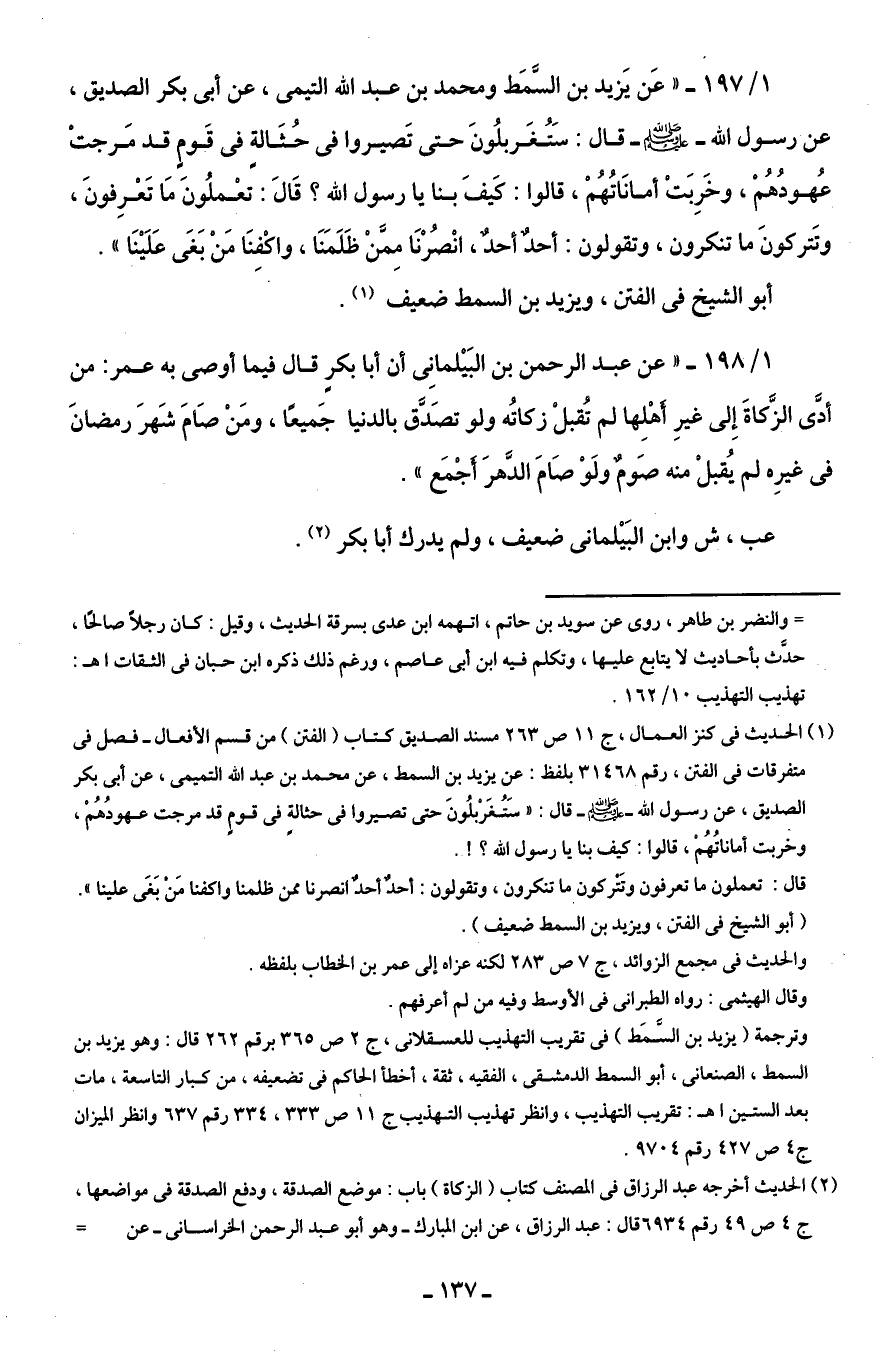 1/ 198 - "عن عبد الرحمن بن البَيْلمانِى أن أبا بكرٍ قال فيما أوصى به عمر: من أدَّى الزَّكاةَ إِلى غيرِ أَهْلِها لم تُقبلْ زكاتُه ولو تصَدَّق بالدنيا جَميعًا، ومَنْ صَامَ شَهرَ رمضانَ في غيرِه لم يُقبلْ منه صَومٌ ولَوْ صَامَ الدَّهرَ أَجْمَع".