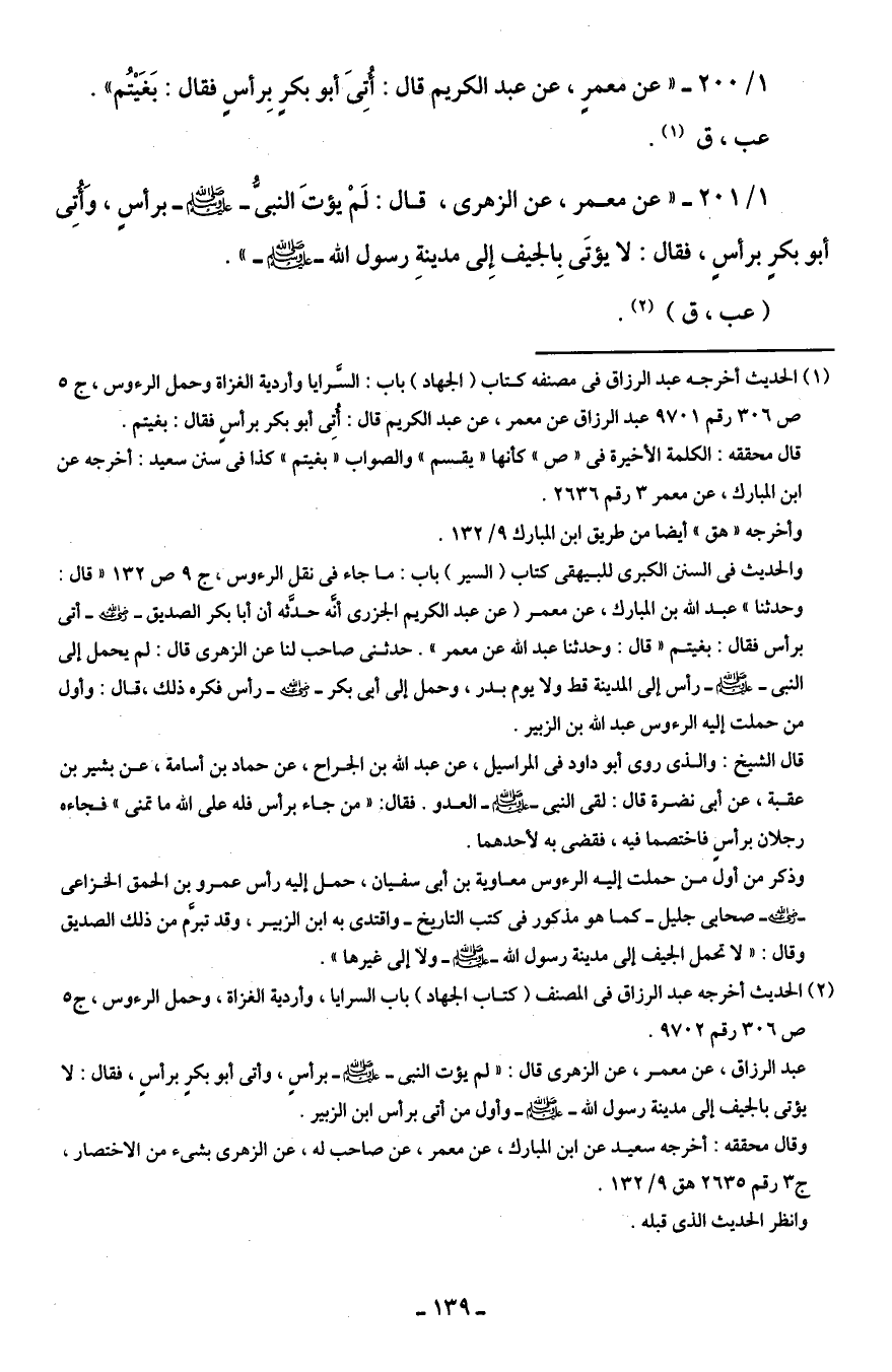 1/ 201 - "عن معمر، عن الزهرى، قال: لَمْ يؤتَ النبىُّ - صلى الله عليه وسلم - برأسٍ، وَأُتِى أبو بكرٍ برأسٍ، فقال: لا يؤتَى بِالجيف إِلى مدينةِ رسول الله - صلى الله عليه وسلم -".