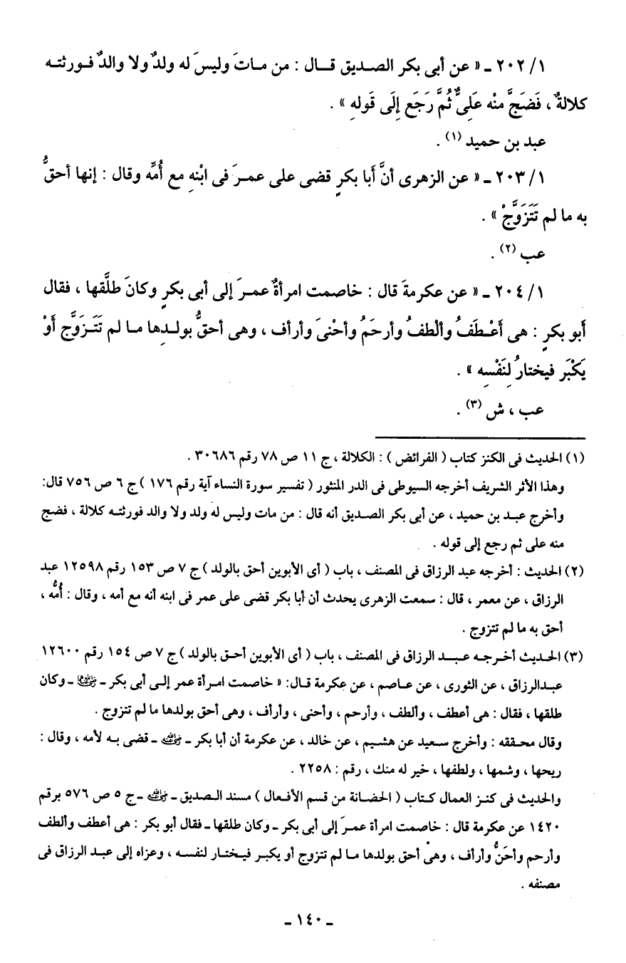 1/ 202 - "عن أبى بكر الصديق قال: من ماتَ وليسَ له ولدٌ ولا والدٌ فورثته كلالةٌ، فَضَجَّ منْه عَلِىٌّ ثُمَّ رَجَع إِلَى قَولهِ".