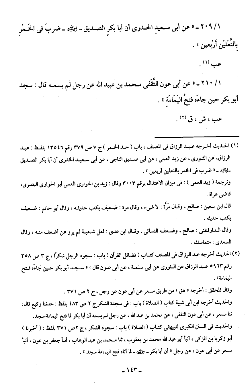 1/ 210 - "عن أبى عون الثَّقَفى محمد بن عبيد الله عن رجل لم يسمه قال: سجد أبو بكر حين جاءَه فتحُ اليَمَامَةِ".