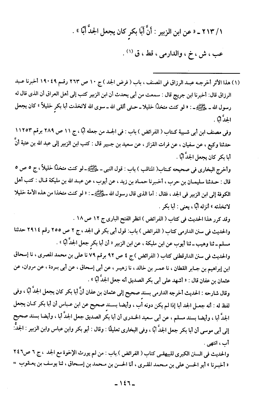 1/ 213 - "عن ابن الزبير: أَنَّ أَبَا بكرٍ كان يجعل الجدَّ أبًا".