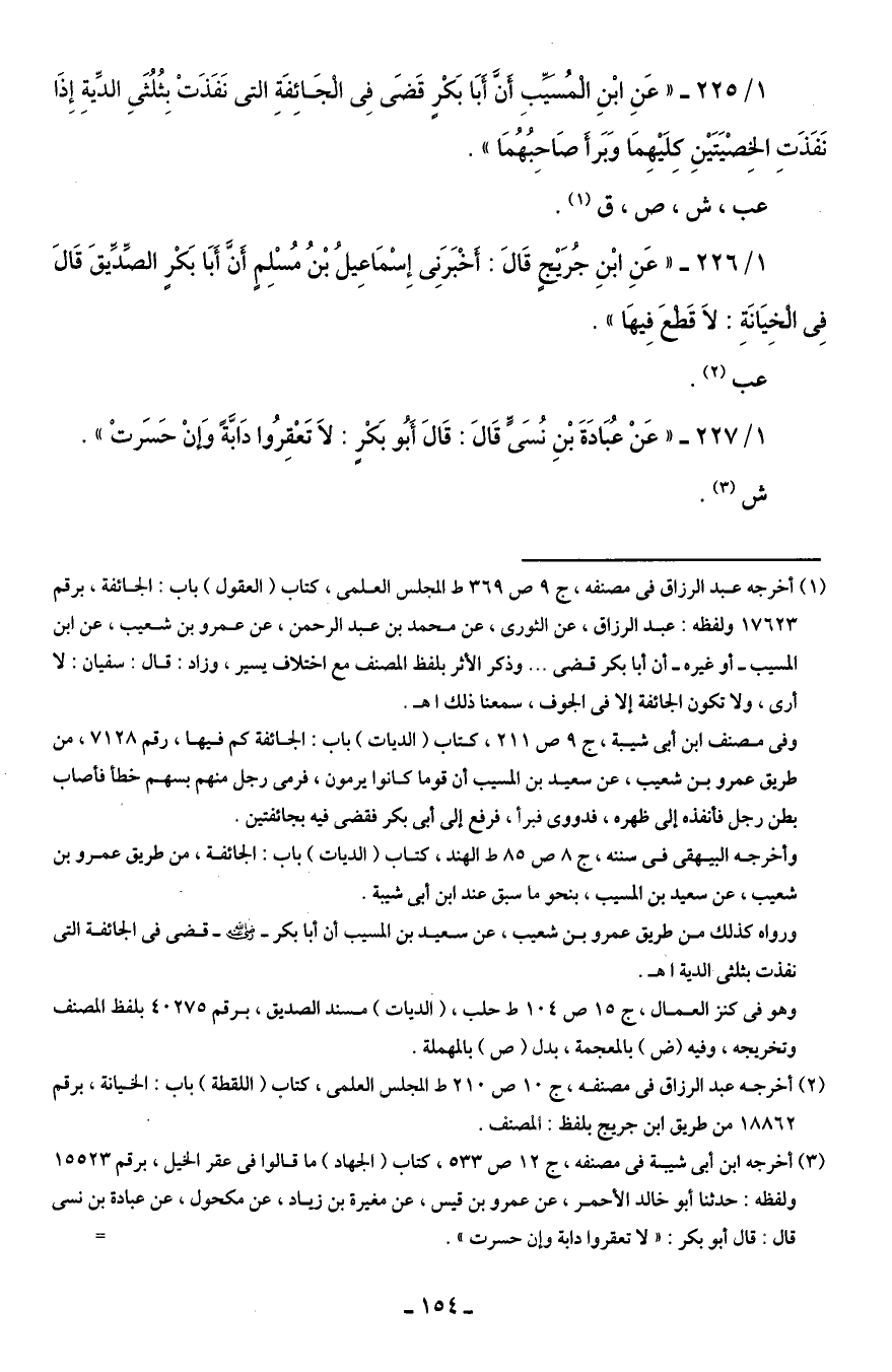 1/ 225 - "عَنِ ابْنِ الْمُسَيِّبِ أَنَّ أَبَا بَكْرٍ قَضَى فِى الْجَائِفَةِ التى نَفَذَتْ بِثُلُثَىِ الدِّيةِ إِذَا نَفَذَتِ الخِصْيَتَيْنِ كِلَيْهِمَا وَبَرأَ صَاحِبُهُمَا".
