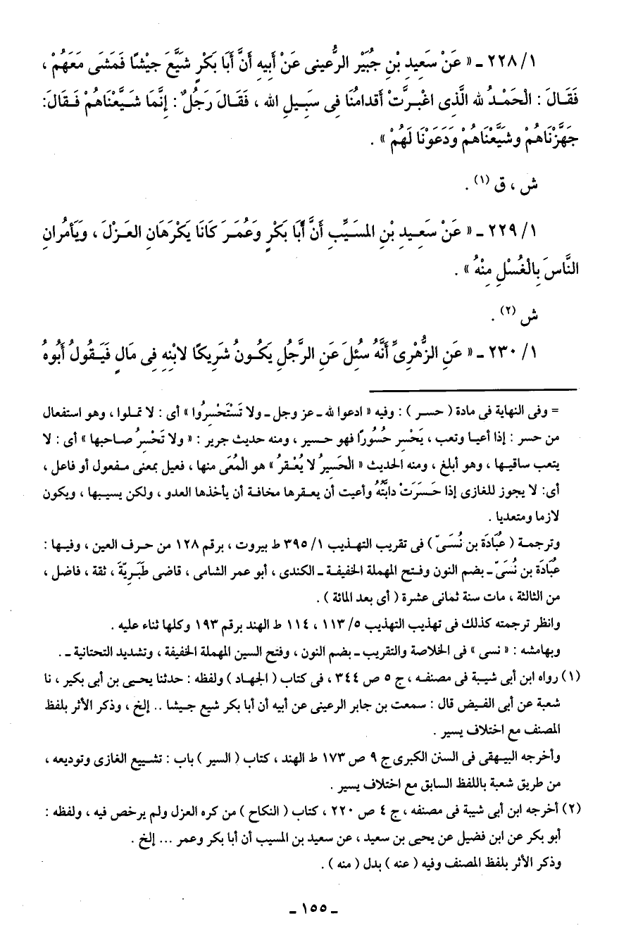 1/ 228 - "عَنْ سَعِيد بْنِ جُبَيْر الرُّعينى عَنْ أَبِيهِ أَنَّ أَبَا بَكْرٍ شَيَّعَ جيْشًا فَمَشَى مَعَهُمْ، فَقَالَ: الْحَمْدُ لله الَّذِى اغْبرَّتْ أَقدامُنَا فِى سَبِيلِ الله، فَقَالَ رَجُلٌ: إِنَّمَا شَيَّعْنَاهُمْ فَقَالَ: جَهَّزْنَاهُمْ وشَيَّعْنَاهُمْ وَدَعَوْنَا لَهُمْ".