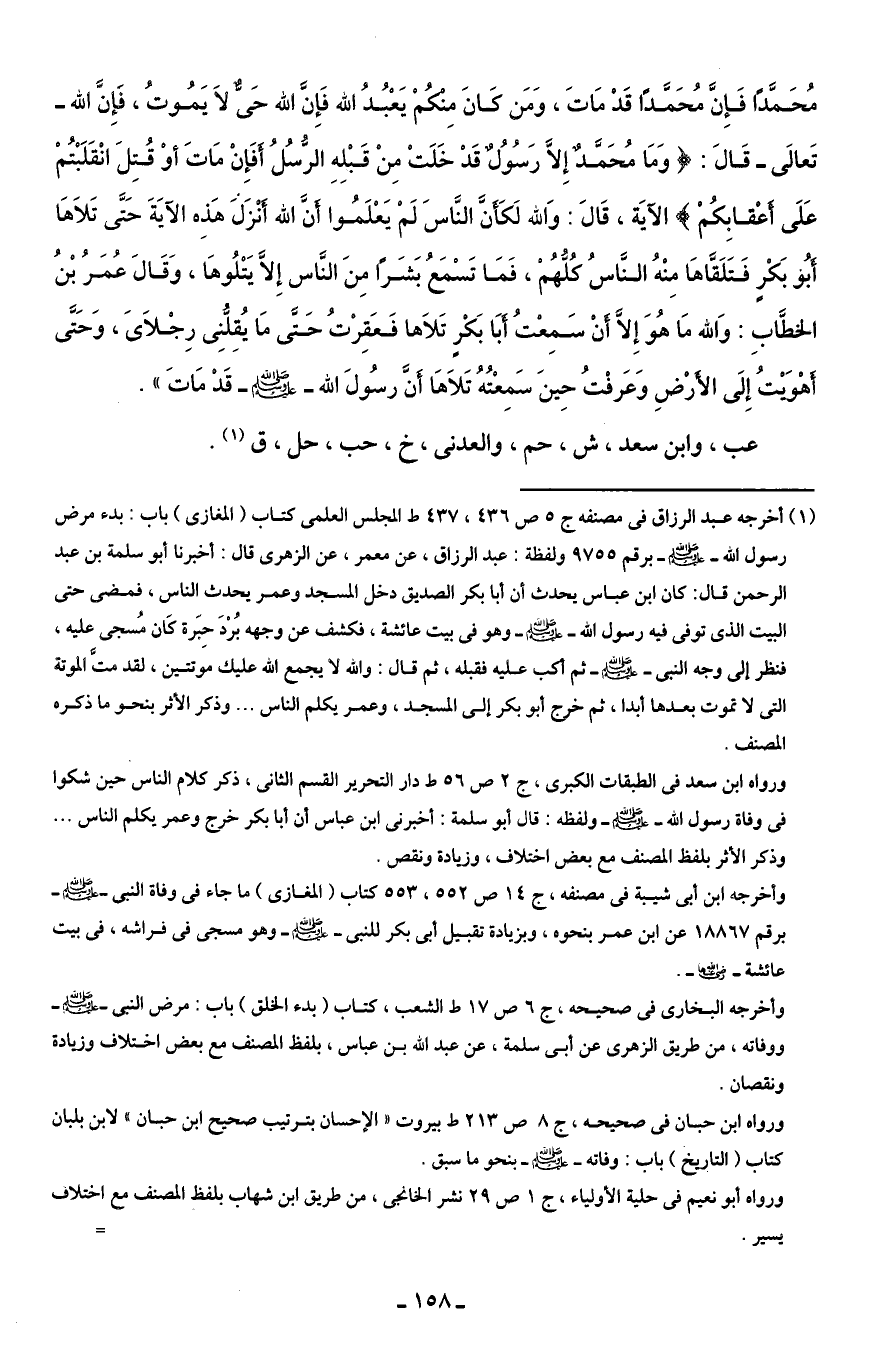 (¬1) أخرجه عبد الرزاق في مصنفه ج 5 ص 436، 437 ط المجلس العلمى كتاب (المغازى) باب: بدء مرض رسول الله - صلى الله عليه وسلم - برقم 9755 ولفظة: عبد الرزاق، عن معمر، عن الزهرى قال: أخبرنا أبو سلمة بن عبد الرحمن قال: كان ابن عباس يحدث أن أبا بكر الصديق دخل المسجد وعمر يحدث الناس، فمضى حتى البيت الذى توفى فيه رسول الله - صلى الله عليه وسلم - وهو في بيت عائشة، فكشف عن وجهه بُرْدَ حِبَرة كَان مُسجى عليه، فنظر إلى وجه النبى - صلى الله عليه وسلم - ثم أكب عليه فقبله، ثم قال: والله لا يجمع الله عليك موتتين، لقد متَّ الموتة التى لا تموت بعدها أبدا، ثم خرج أبو بكر إلى المسجد، وعمر يكلم الناس ... وذكر الأثر بنحو ما ذكره المصنف.