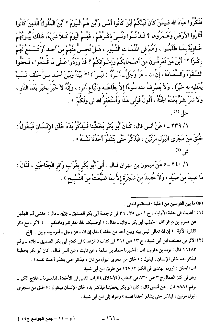 (¬2) الأثر في مصنف ابن أبى شيبة، ج 13 ص 261 في كتاب (الزهد) في كلام أبى بكر الصديق - رضي الله عنه - برقم 16283 قال: يزيد بن هارون قال: أخبرنا حماد بن سلمة، عن ثابت، عن أنس قال: كان أبو بكر يخطبنا فيذكر بدء خلق الإنسان، فيقول: "خلق من مجرى البول من نتن، فيذكر حتى يتقذر أحدنا نفسه".