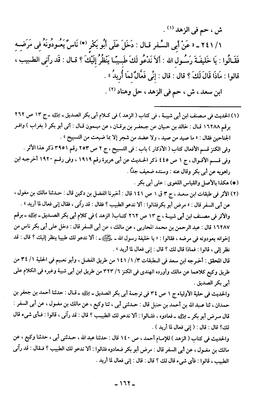 1/ 241 - "عَنْ أَبِى السَّفر قال: دَخَلَ عَلَى أَبُو بَكْرٍ (*) نَاسٌ يَعُودُونَهُ فِى مَرَضِهِ فَقَالُوا: يَا خَليفَةَ رَسُولِ الله: أَلَا نَدْعُو لَكَ طَبيبًا يَنْظُرُ إِلَيْكَ؟ قال: قَد رآنِى الطبيب، قالوا: مَاذَا قَالَ لَكَ؟ قال: قال: إِنِّى فَعَّالٌ لِمَا أُرِيدُ".