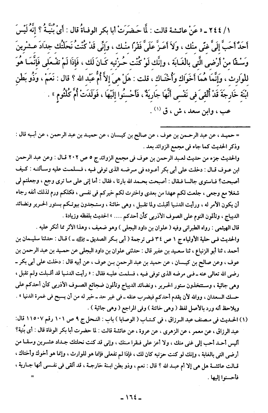 1/ 244 - "عَنْ عائشة قالت: لمَّا حَضَرَتْ أبا بكر الوفاةُ قال: أَىْ بُنَيَّةُ؟ إِنَّهُ لَيْسَ أحَدٌ أَحَبَّ إِلَىَّ غِنًى مِنْكِ، وَلَا أَعَزَّ عَلَىَّ فَقْرًا مِنْكِ، وَإِنِّى قَدْ كُنْتُ نَحَلْتُكِ جِدَادَ عِشْرِينَ وَسْقًا مِنْ أَرْضِى الَّتِى بالْغَابَة، وإنَّكِ لَوْ كُنْتِ حُزْتِيهِ كَانَ لَكِ، فَإِذَا لَمْ تفْعَلِى فَإِنَّمَا هُوَ لِلْوَارِثِ، وَإِنَّمَا هُمَا أَخَوَاكِ وَأُخْتَاكِ، قلت: هَلْ هِىَ إِلَّا أُمُّ عَبْدِ الله؟ قال: نَعَمْ، وَذُو بَطْنِ ابْنَةِ خَارِجَةَ قَدْ أُلْقِىَ فِى نَفْسِى أَنَّهَا جَارِيَةٌ، فَأَحْسِنُوا إِلَيْهَا، فَوَلَدَتْ أُمَّ كُلْثُومٍ".